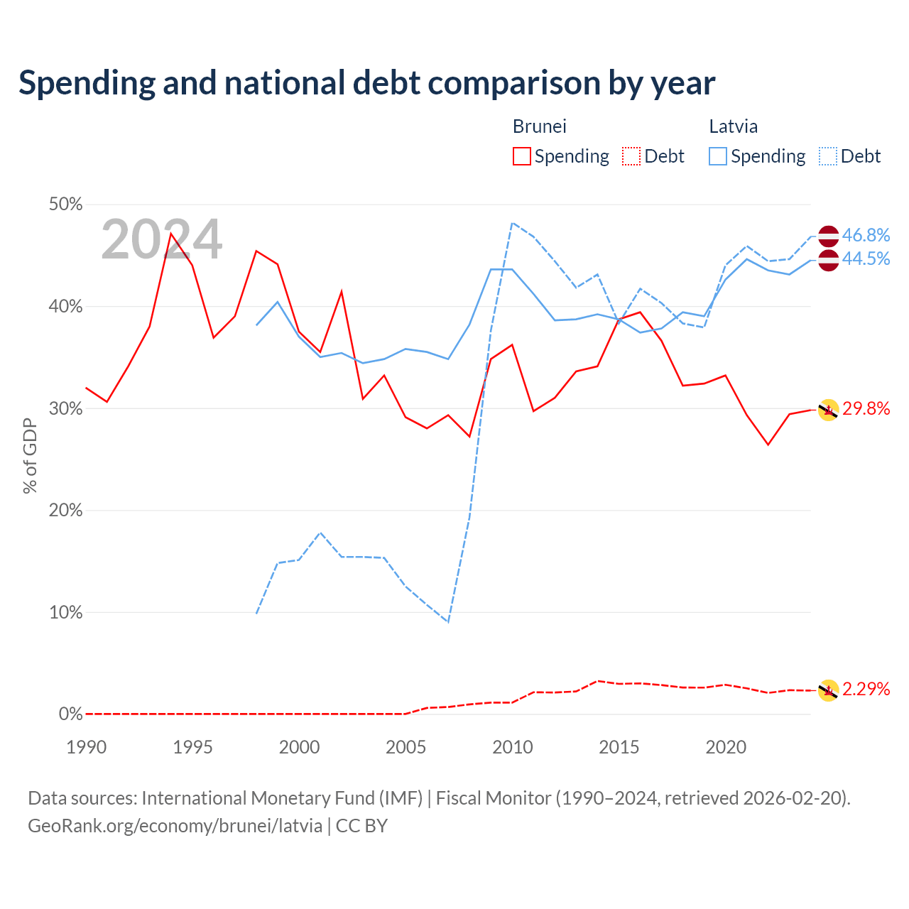 Brunei has $351M in government debt (2.29% of GDP), compared to $20.4B (46.8% of GDP) in Latvia.
