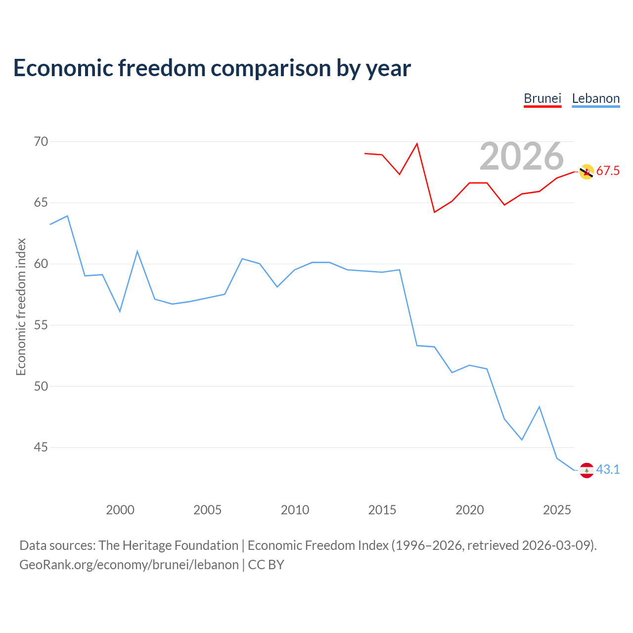 The Economic Freedom Index for Brunei is 67.5, ranking 55/197, compared to 43.1 for Lebanon, ranking 183/197. The chart above displays a comparison of annual changes in economic freedom indexes.