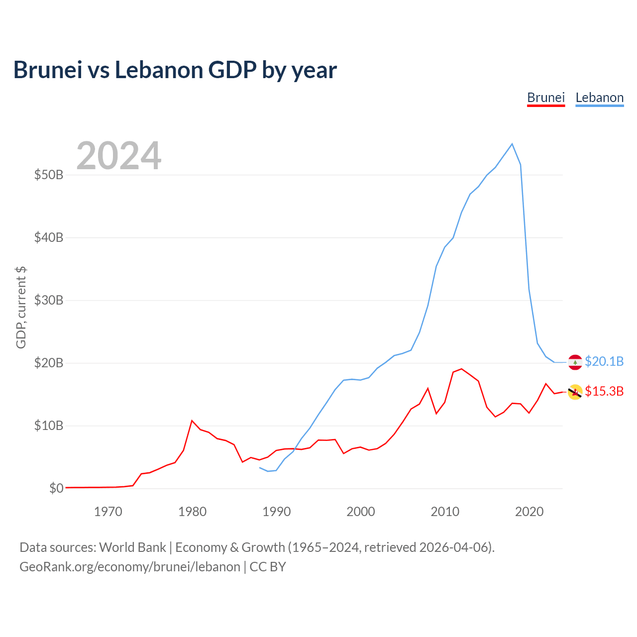 Brunei has a GDP of $15.3B compared to $20.1B for Lebanon, ranking 142/197 and 128/197 by economy size, respectively.