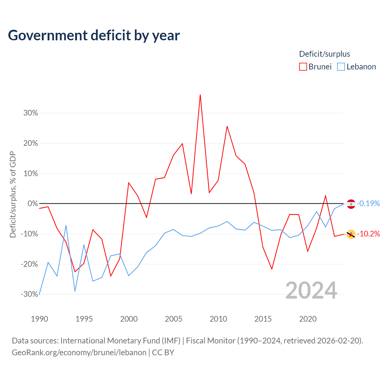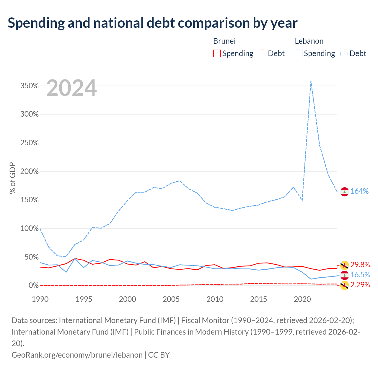 Brunei has $351M in government debt (2.29% of GDP), compared to $38.7B (163.8% of GDP) in Lebanon.