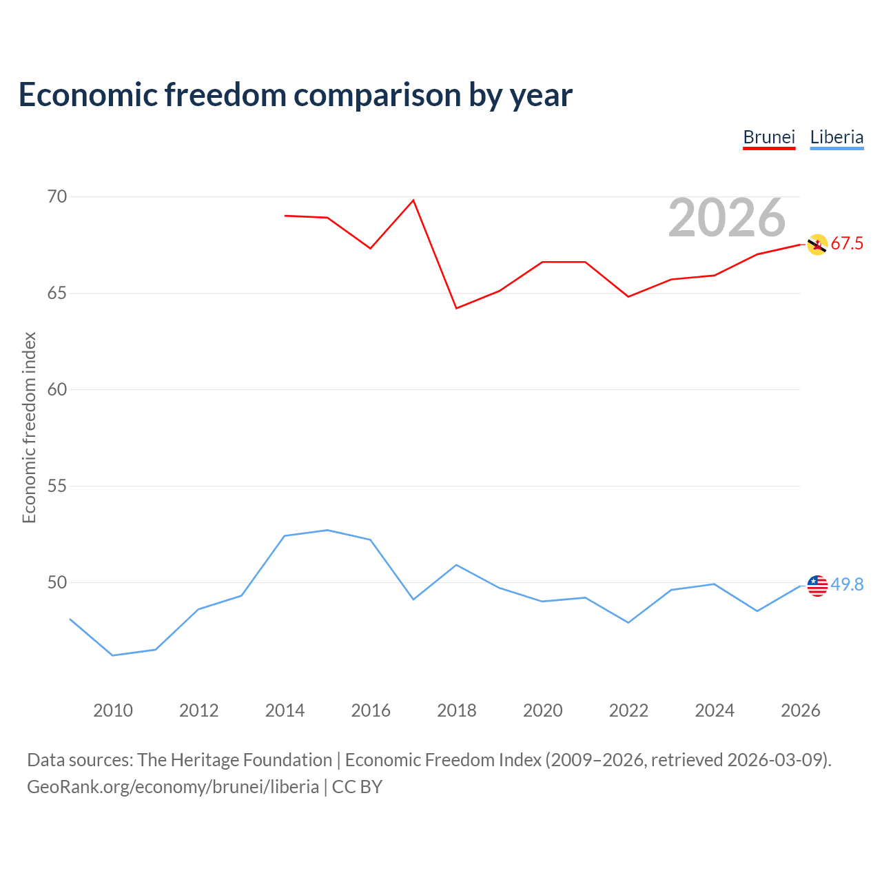 The Economic Freedom Index for Brunei is 67.5, ranking 55/197, compared to 49.8 for Liberia, ranking 163/197. The chart above displays a comparison of annual changes in economic freedom indexes.