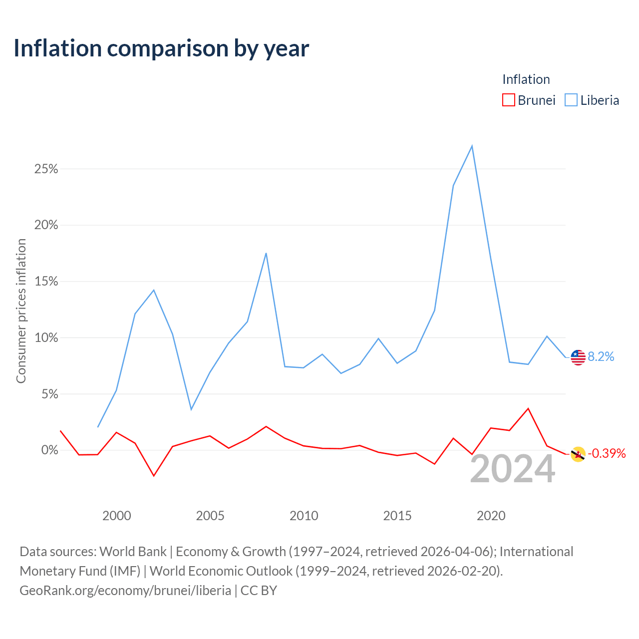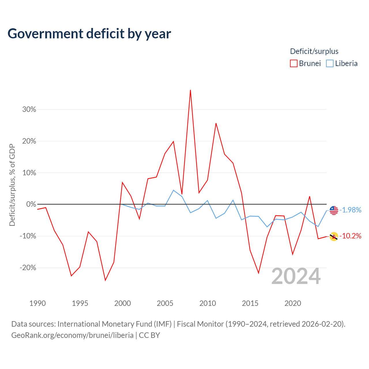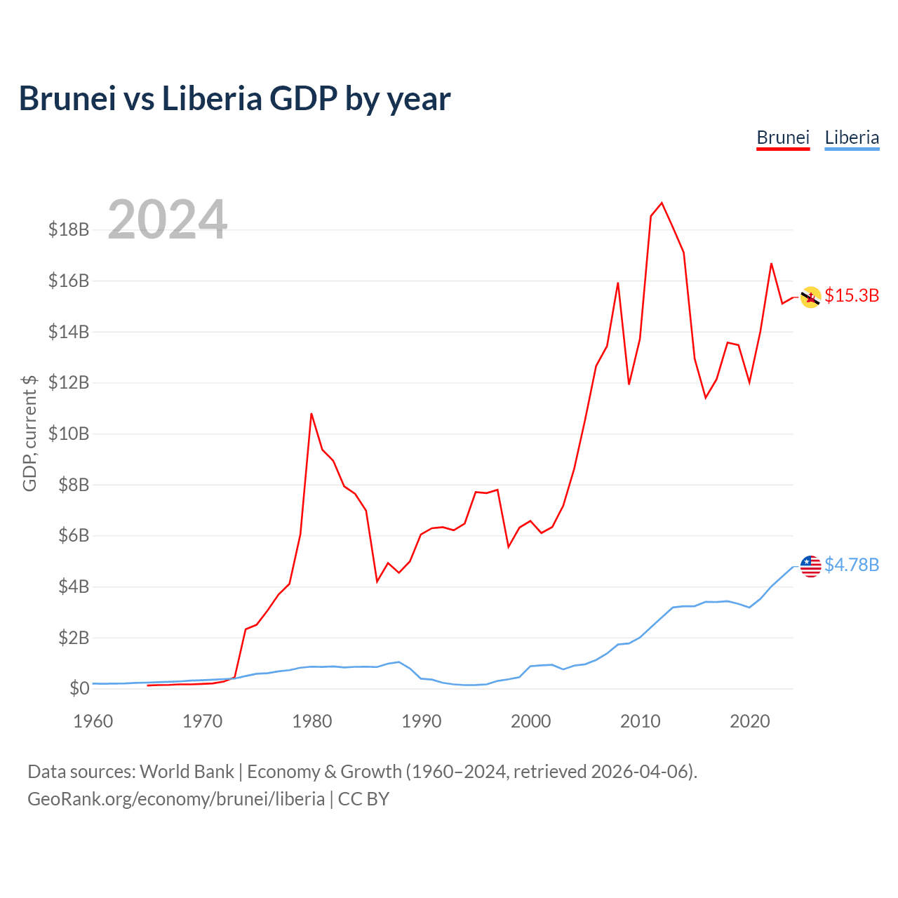 Brunei has a GDP of $15.3B compared to $4.78B for Liberia, ranking 142/197 and 163/197 by economy size, respectively.
