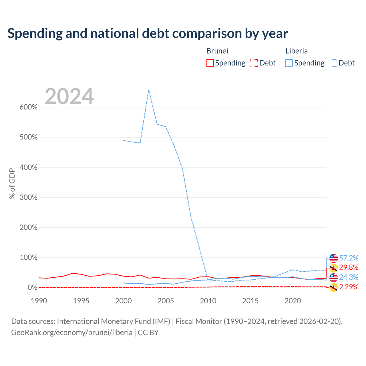 Brunei has $351M in government debt (2.29% of GDP), compared to $2.73B (57.2% of GDP) in Liberia.