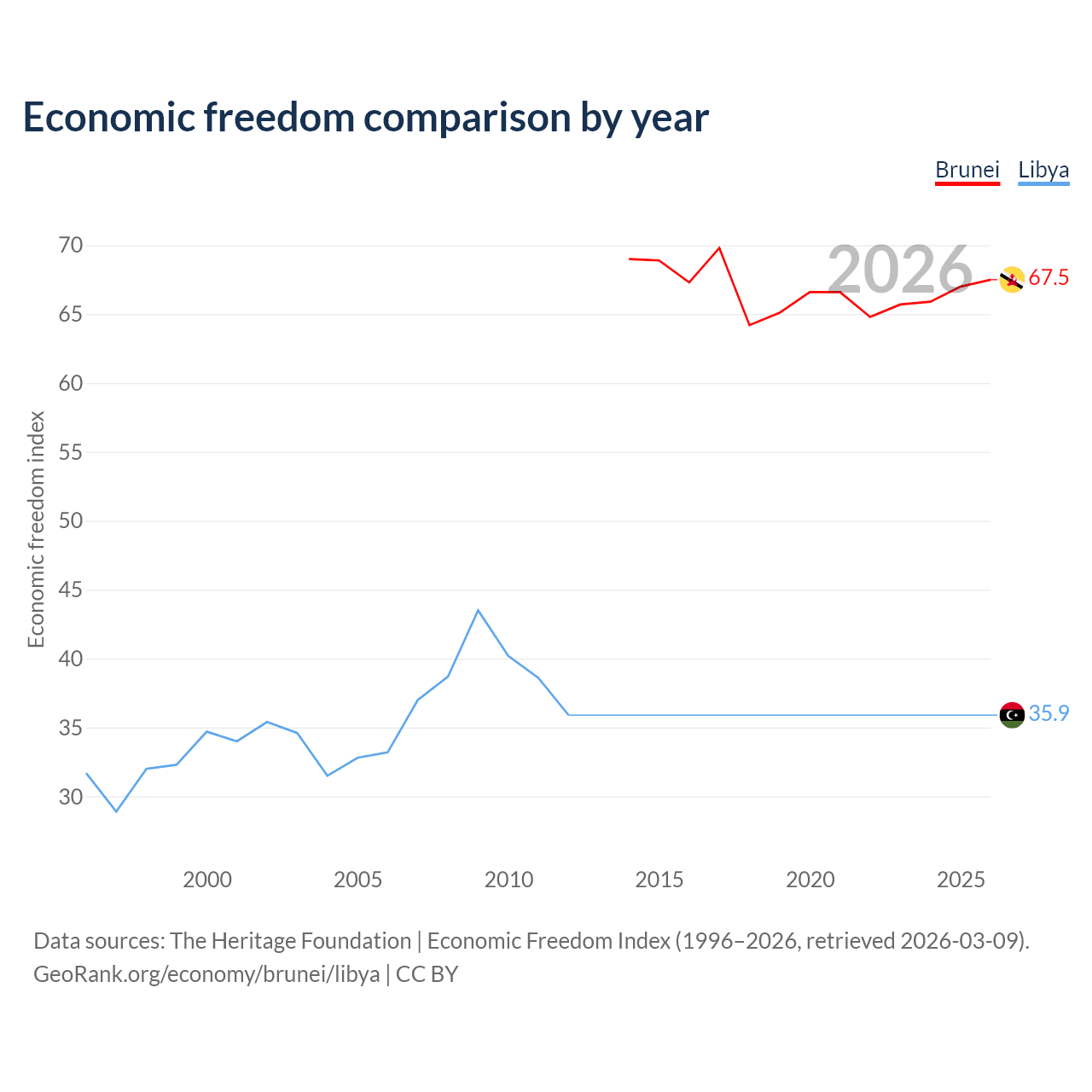 The Economic Freedom Index for Brunei is 67.5, ranking 55/197, compared to 35.9 for Libya, ranking 189/197. The chart above displays a comparison of annual changes in economic freedom indexes.