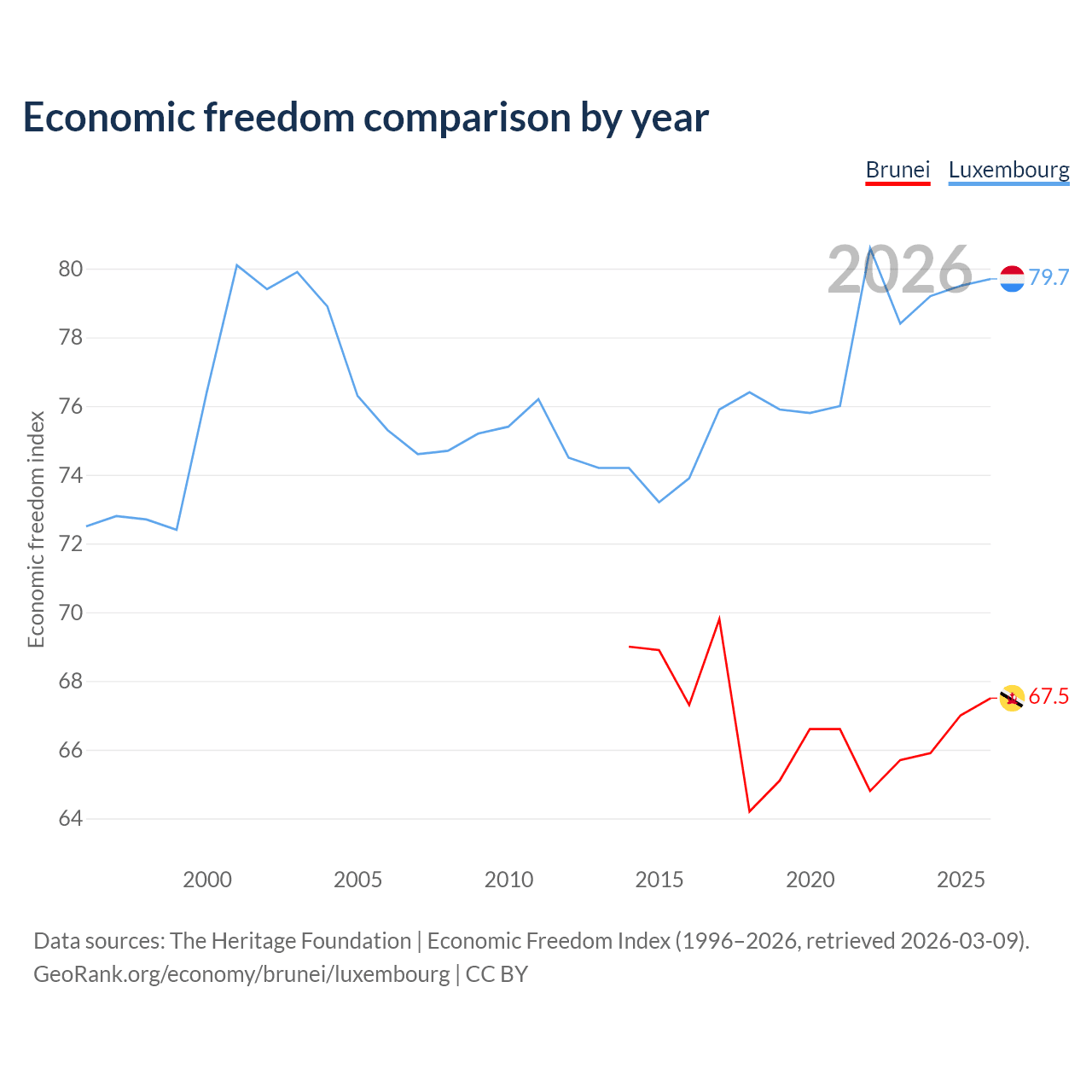 The Economic Freedom Index for Brunei is 67.5, ranking 55/197, compared to 79.7 for Luxembourg, ranking 7/197. The chart above displays a comparison of annual changes in economic freedom indexes.