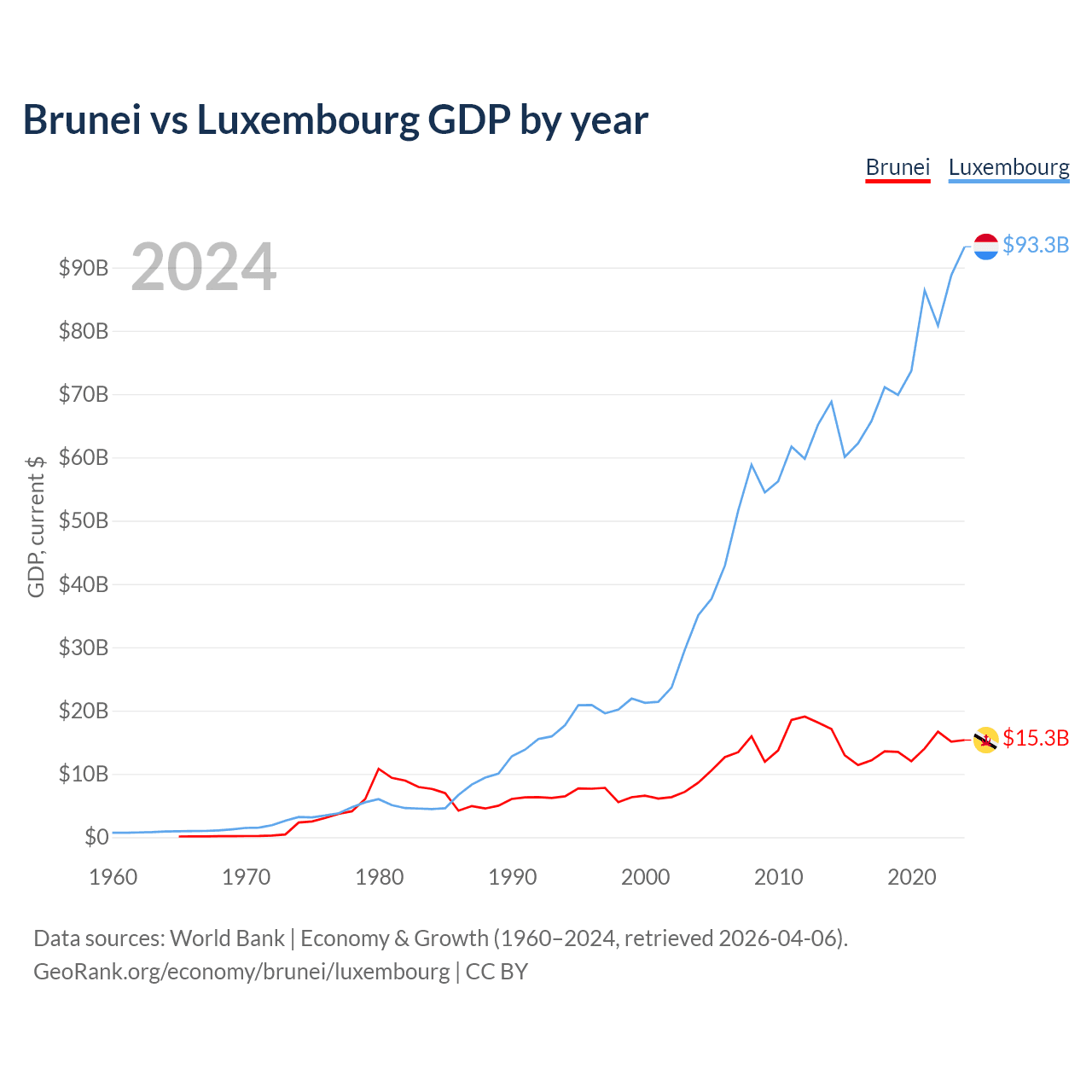 Brunei has a GDP of $15.3B compared to $93.3B for Luxembourg, ranking 142/197 and 74/197 by economy size, respectively.