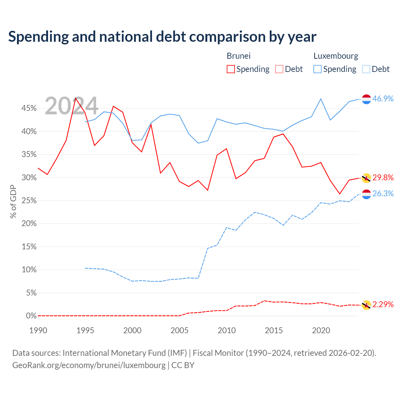 Brunei has $351M in government debt (2.29% of GDP), compared to $24.5B (26.3% of GDP) in Luxembourg.