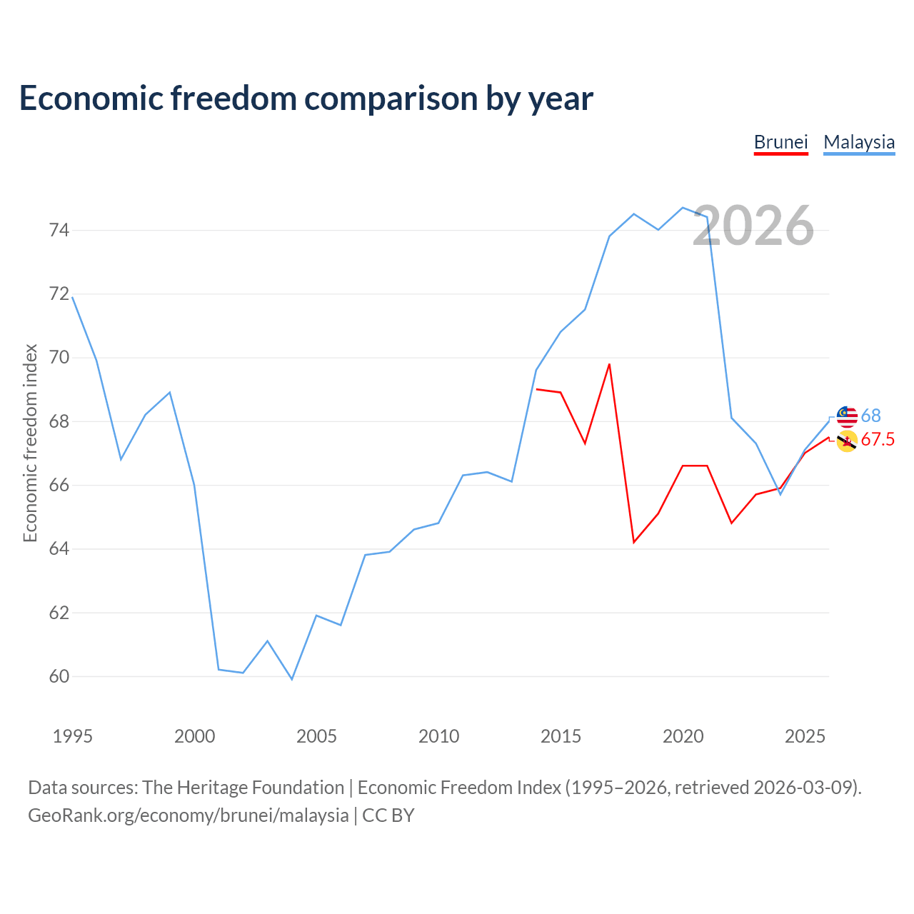 The Economic Freedom Index for Brunei is 67.5, ranking 55/197, compared to 68 for Malaysia, ranking 51/197. The chart above displays a comparison of annual changes in economic freedom indexes.