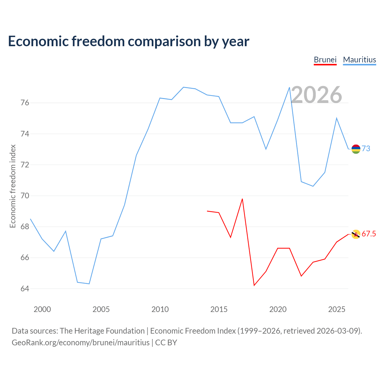 The Economic Freedom Index for Brunei is 67.5, ranking 55/197, compared to 73 for Mauritius, ranking 26/197. The chart above displays a comparison of annual changes in economic freedom indexes.
