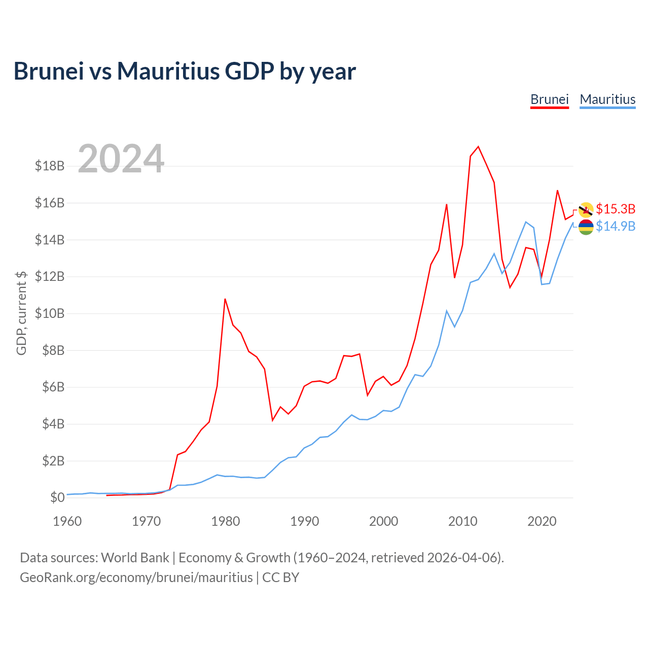 Brunei has a GDP of $15.3B compared to $14.9B for Mauritius, ranking 142/197 and 143/197 by economy size, respectively.