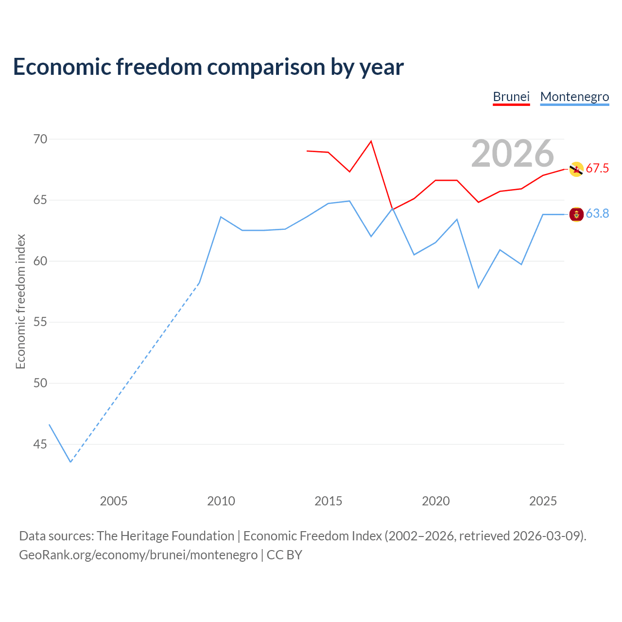 The Economic Freedom Index for Brunei is 67.5, ranking 55/197, compared to 63.8 for Montenegro, ranking 78/197. The chart above displays a comparison of annual changes in economic freedom indexes.