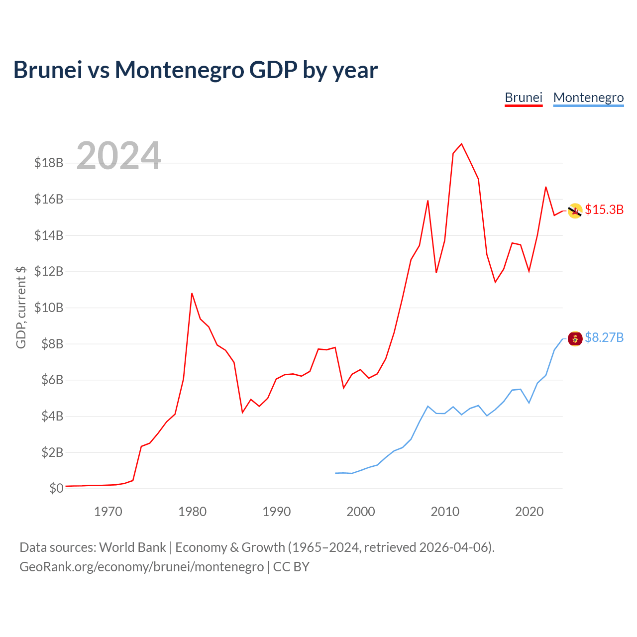 Brunei has a GDP of $15.3B compared to $8.27B for Montenegro, ranking 142/197 and 155/197 by economy size, respectively.