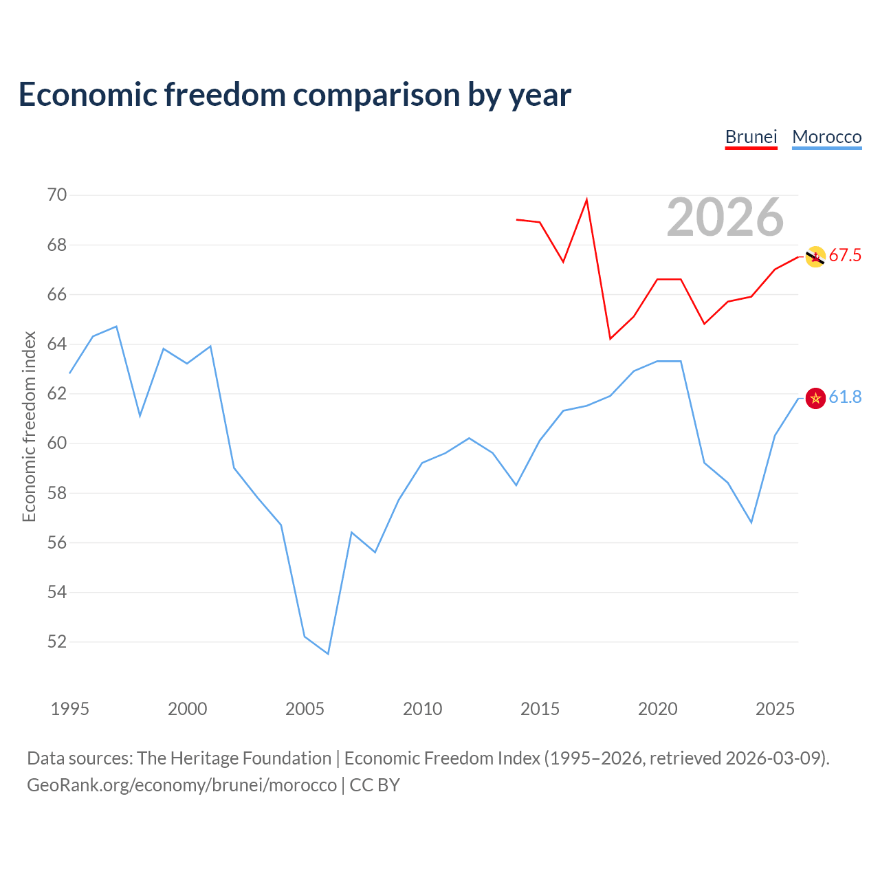 The Economic Freedom Index for Brunei is 67.5, ranking 55/197, compared to 61.8 for Morocco, ranking 91/197. The chart above displays a comparison of annual changes in economic freedom indexes.