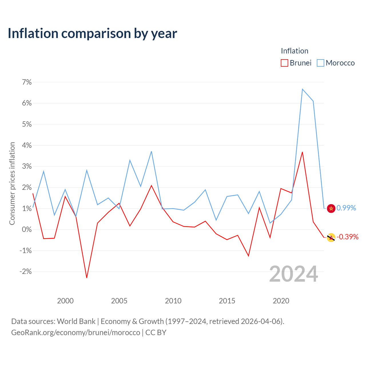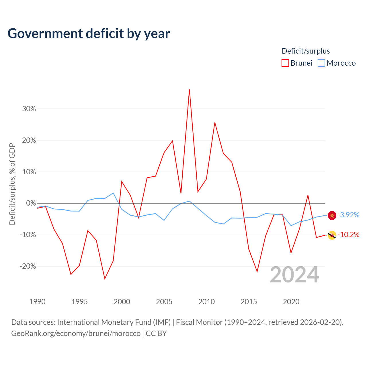 Brunei has a GDP of $15.3B compared to $161B for Morocco, ranking 142/197 and 58/197 by economy size, respectively.