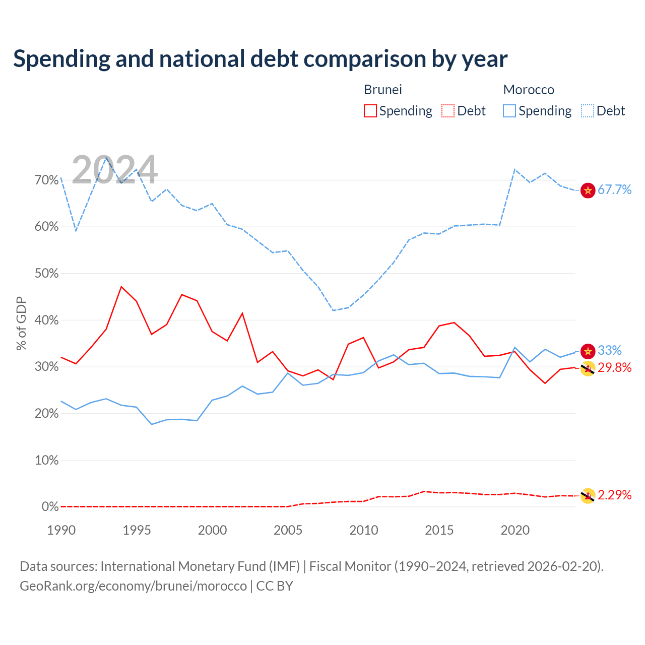 Brunei has $351M in government debt (2.29% of GDP), compared to $109B (67.7% of GDP) in Morocco.