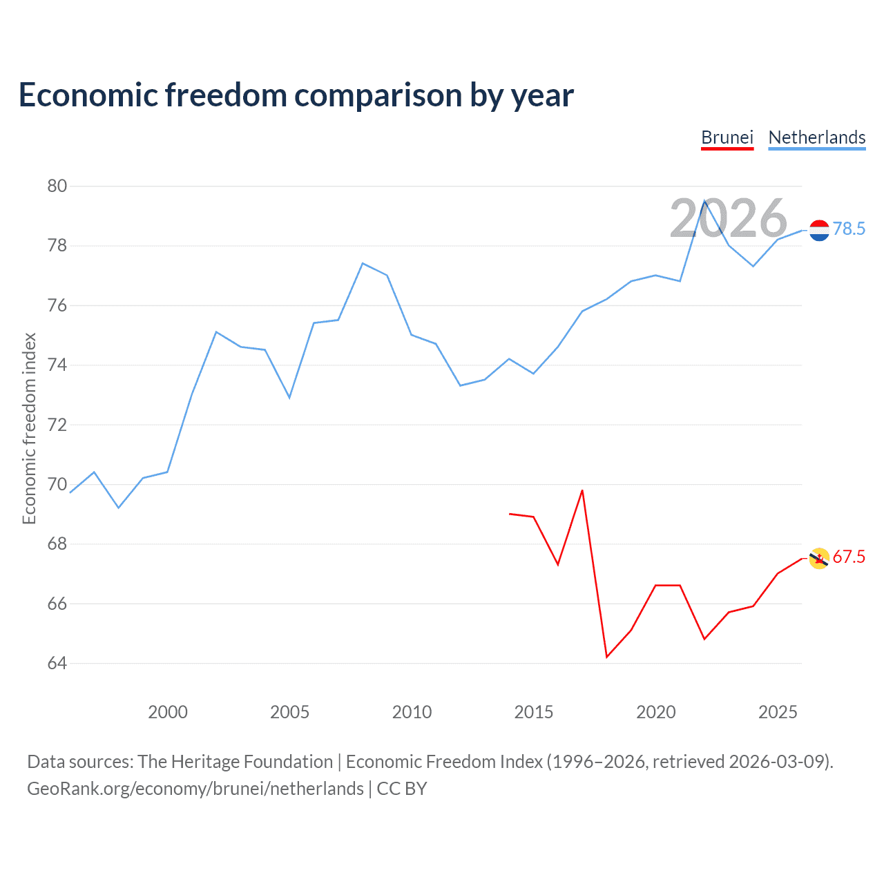 The Economic Freedom Index for Brunei is 67.5, ranking 55/197, compared to 78.5 for the Netherlands, ranking 11/197. The chart above displays a comparison of annual changes in economic freedom indexes.