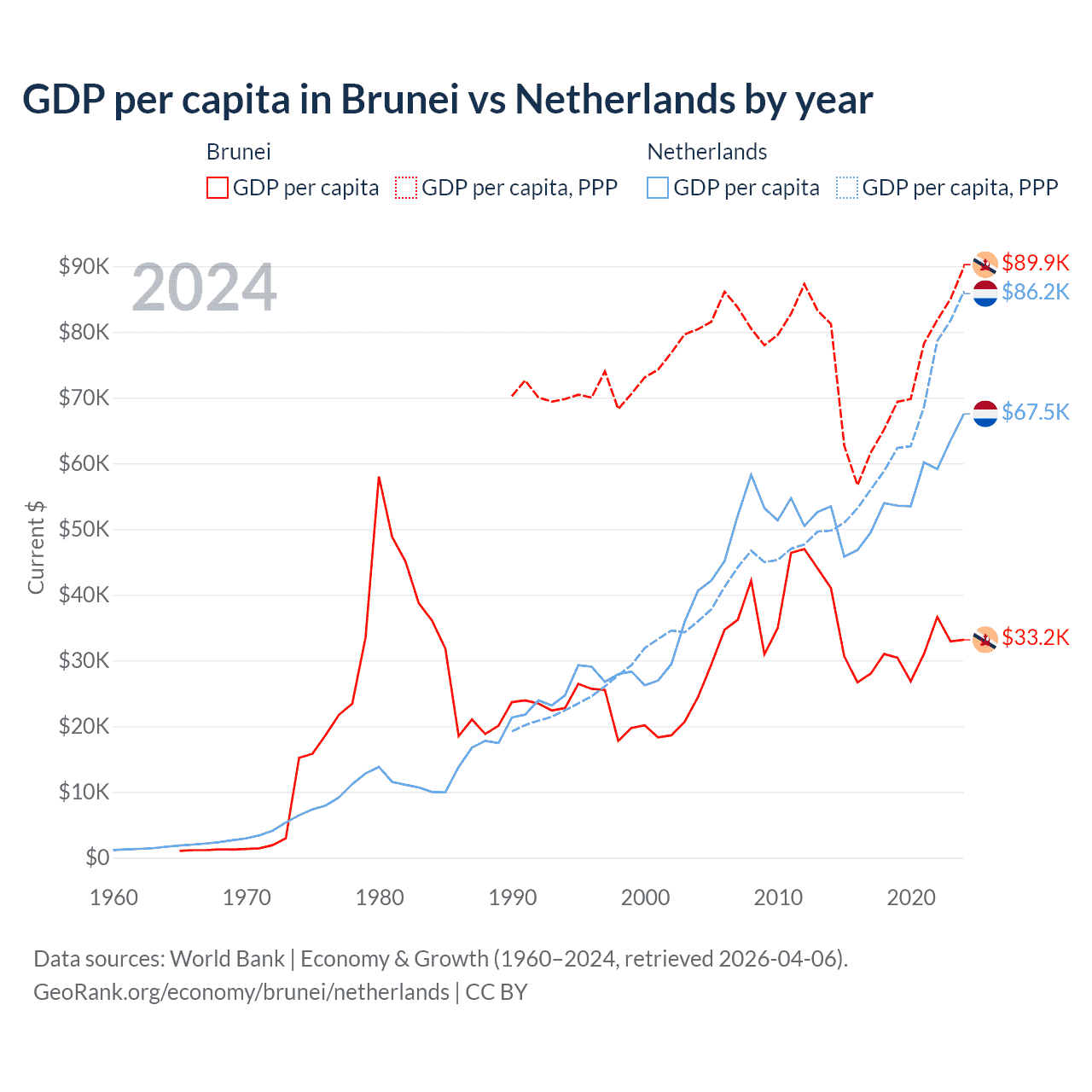 GDP per capita in Brunei vs Netherlands by year