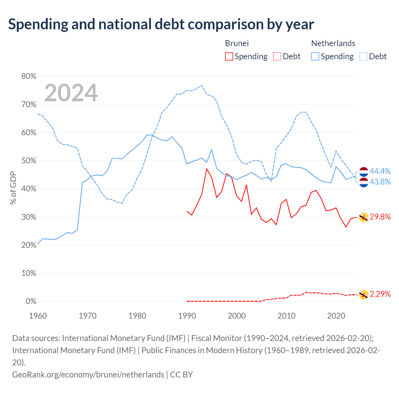 Brunei has $351M in government debt (2.29% of GDP), compared to $532B (43.8% of GDP) in the Netherlands.