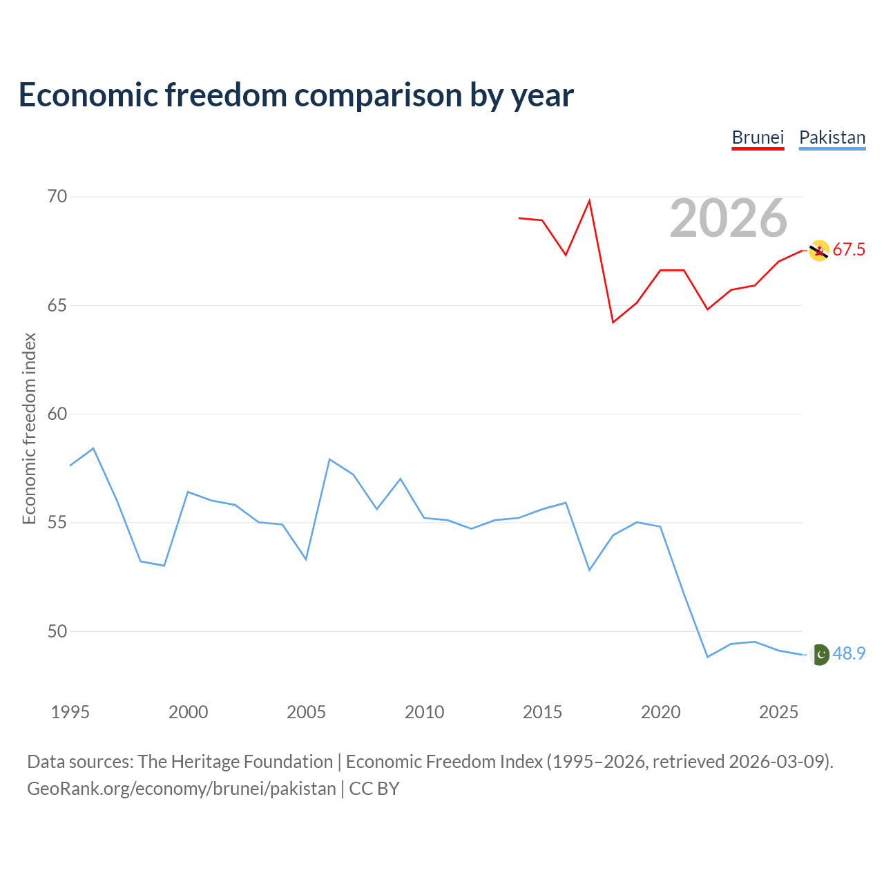 The Economic Freedom Index for Brunei is 67.5, ranking 55/197, compared to 48.9 for Pakistan, ranking 168/197. The chart above displays a comparison of annual changes in economic freedom indexes.