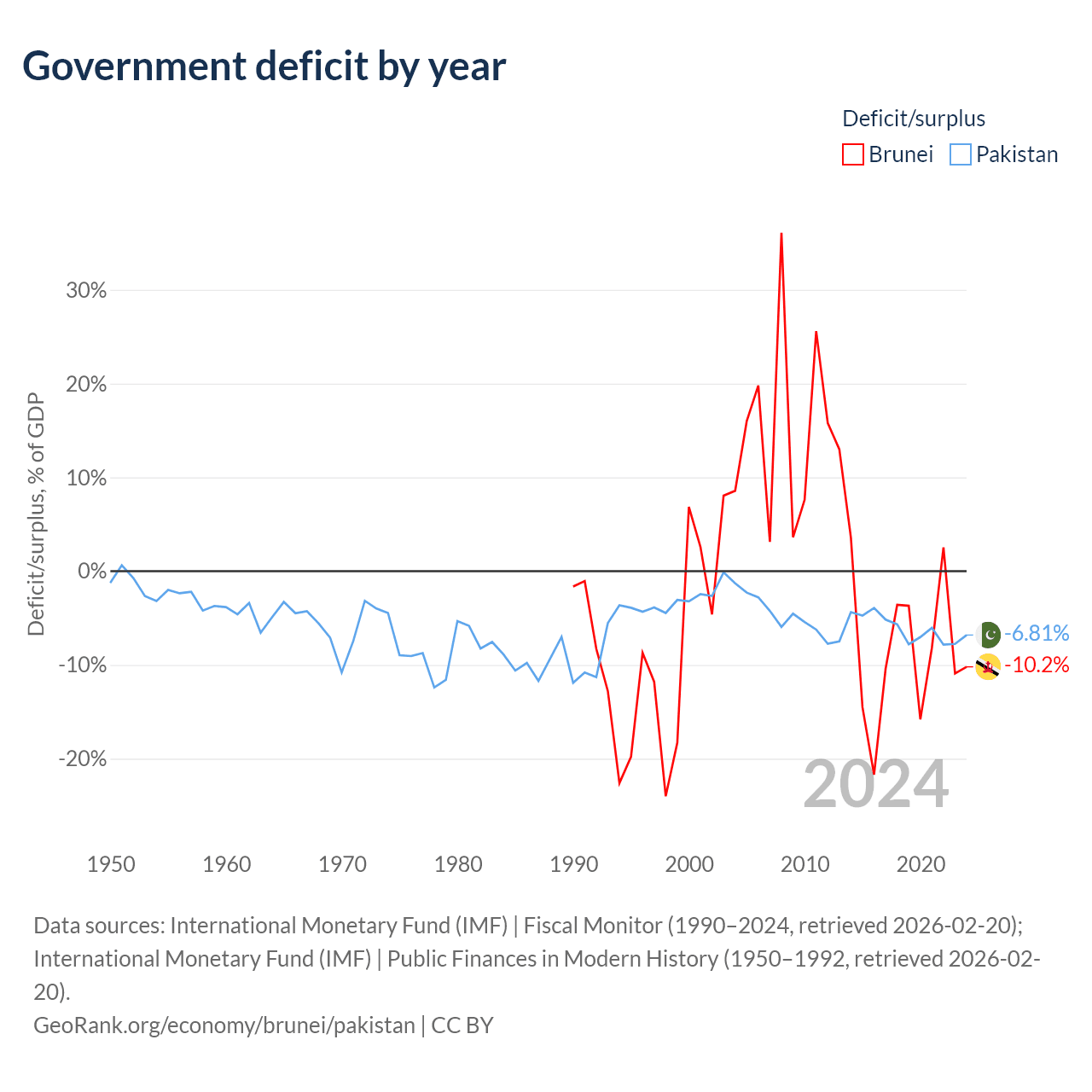 Brunei has a GDP of $15.3B compared to $372B for Pakistan, ranking 142/197 and 43/197 by economy size, respectively.