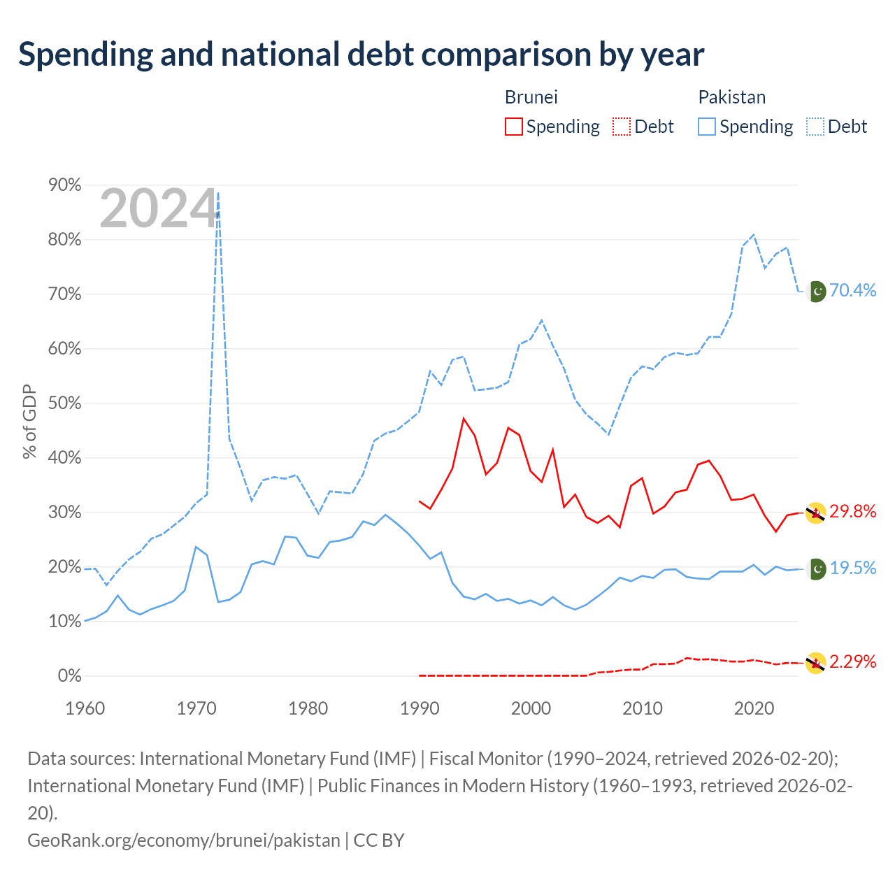 Brunei has $351M in government debt (2.29% of GDP), compared to $262B (70.4% of GDP) in Pakistan.
