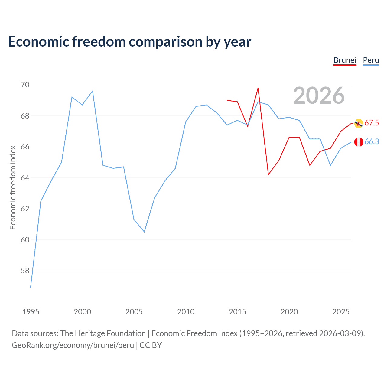 The Economic Freedom Index for Brunei is 67.5, ranking 55/197, compared to 66.3 for Peru, ranking 62/197. The chart above displays a comparison of annual changes in economic freedom indexes.