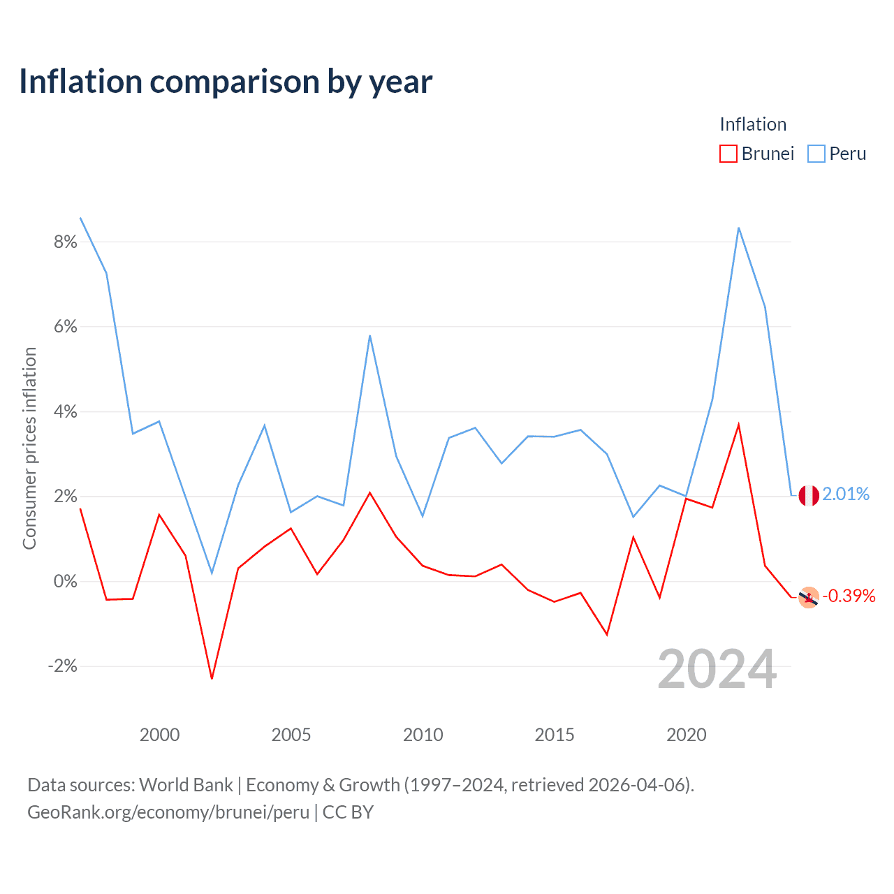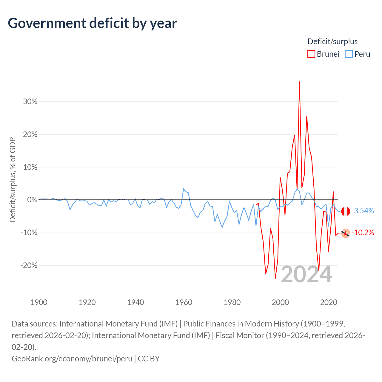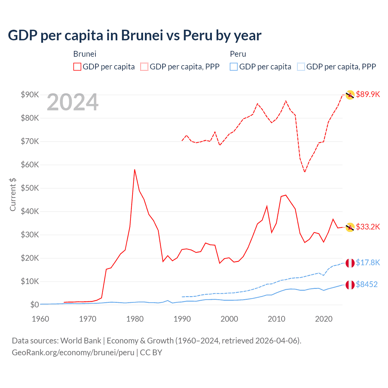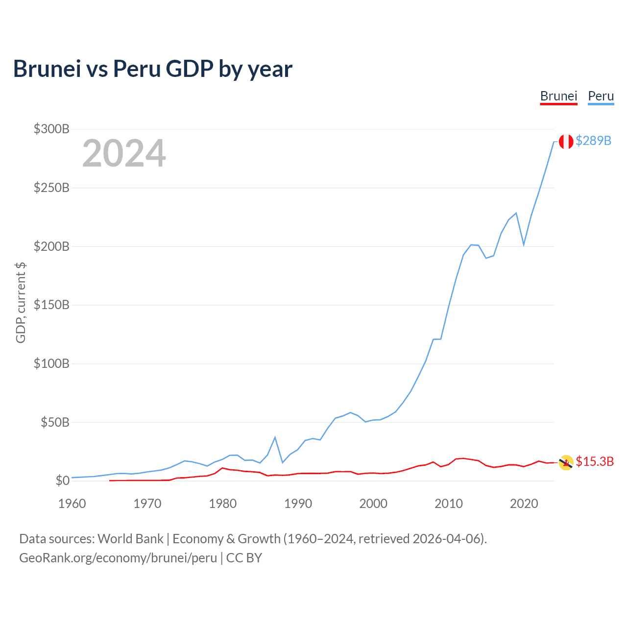 Brunei has a GDP of $15.3B compared to $289B for Peru, ranking 142/197 and 49/197 by economy size, respectively.