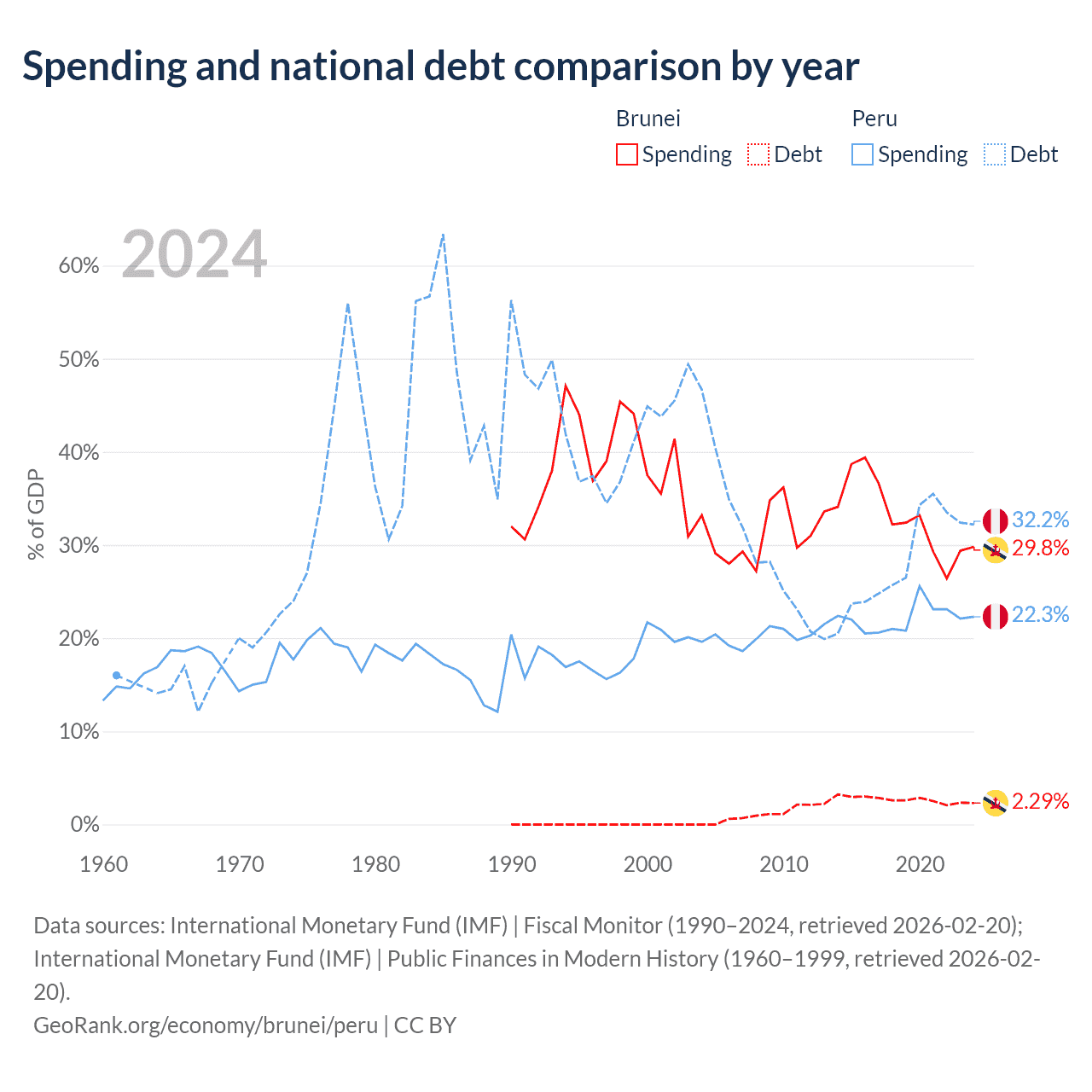Brunei has $351M in government debt (2.29% of GDP), compared to $93B (32.2% of GDP) in Peru.