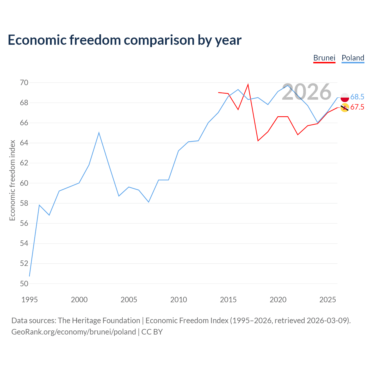 The Economic Freedom Index for Brunei is 67.5, ranking 55/197, compared to 68.5 for Poland, ranking 46/197. The chart above displays a comparison of annual changes in economic freedom indexes.