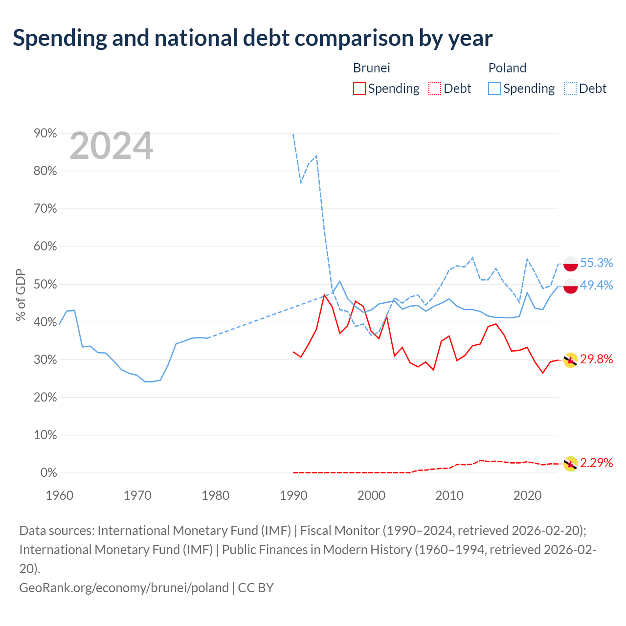 Brunei has $351M in government debt (2.29% of GDP), compared to $507B (55.3% of GDP) in Poland.