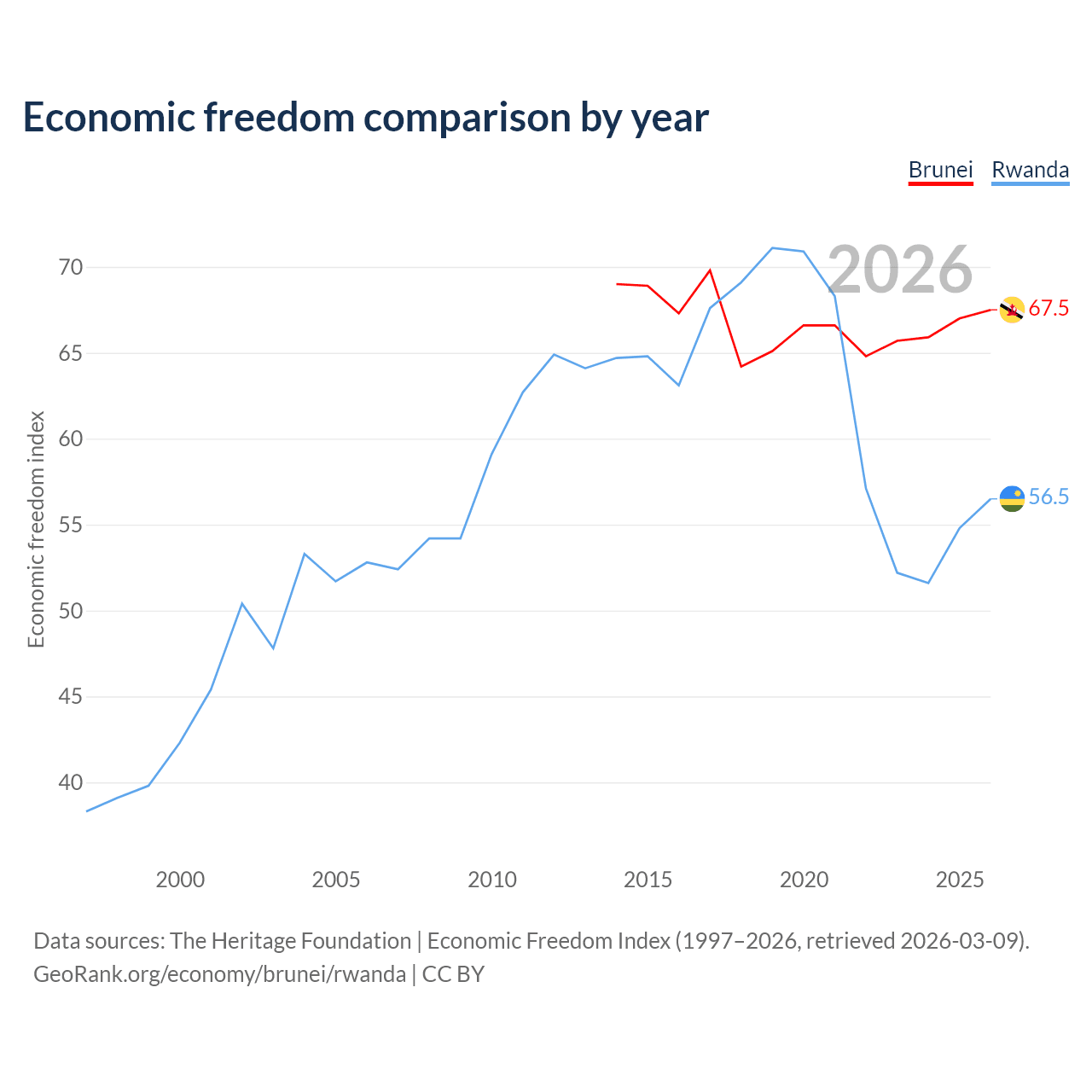 The Economic Freedom Index for Brunei is 67.5, ranking 55/197, compared to 56.5 for Rwanda, ranking 121/197. The chart above displays a comparison of annual changes in economic freedom indexes.