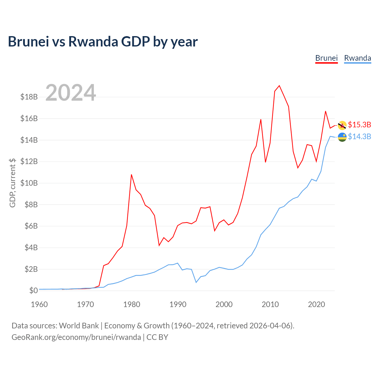 Brunei has a GDP of $15.3B compared to $14.3B for Rwanda, ranking 142/197 and 144/197 by economy size, respectively.