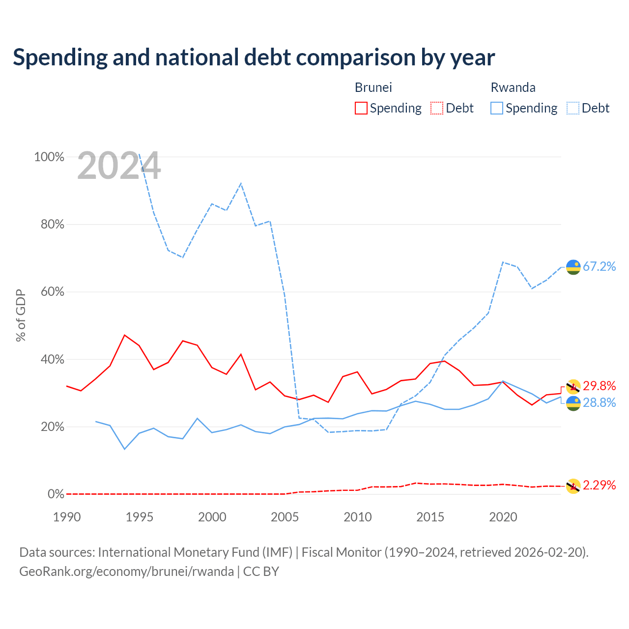Brunei has $351M in government debt (2.29% of GDP), compared to $9.58B (67.2% of GDP) in Rwanda.