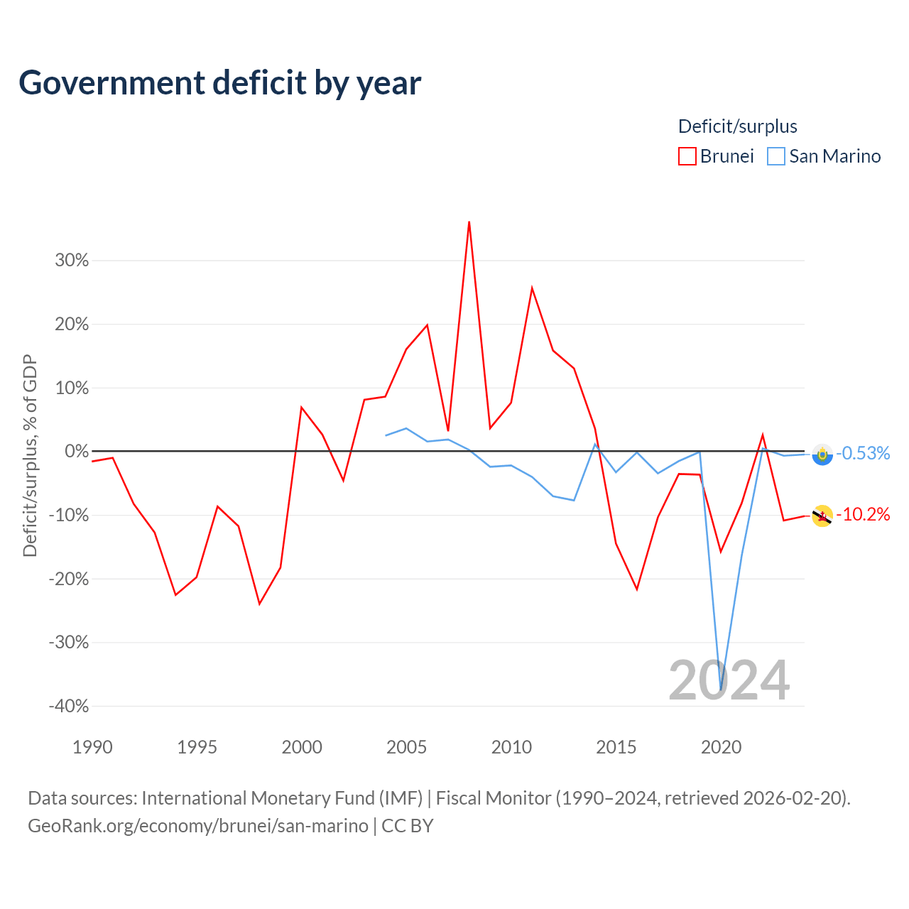 Brunei has a GDP of $15.3B compared to $2.03B for San Marino, ranking 142/197 and 180/197 by economy size, respectively.