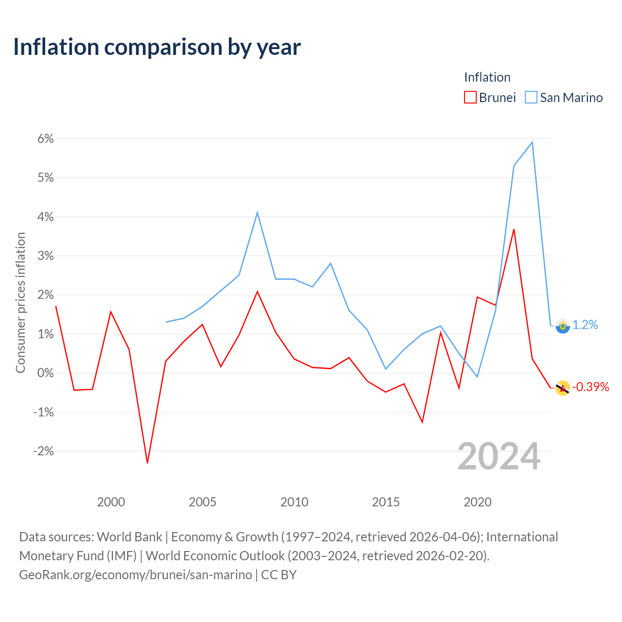 Over the past 22 years, Brunei has recorded an average annual inflation rate of 0.61%, compared with 1.95% in San Marino. In 2024, inflation was -0.39% in Brunei and 1.2% in San Marino.