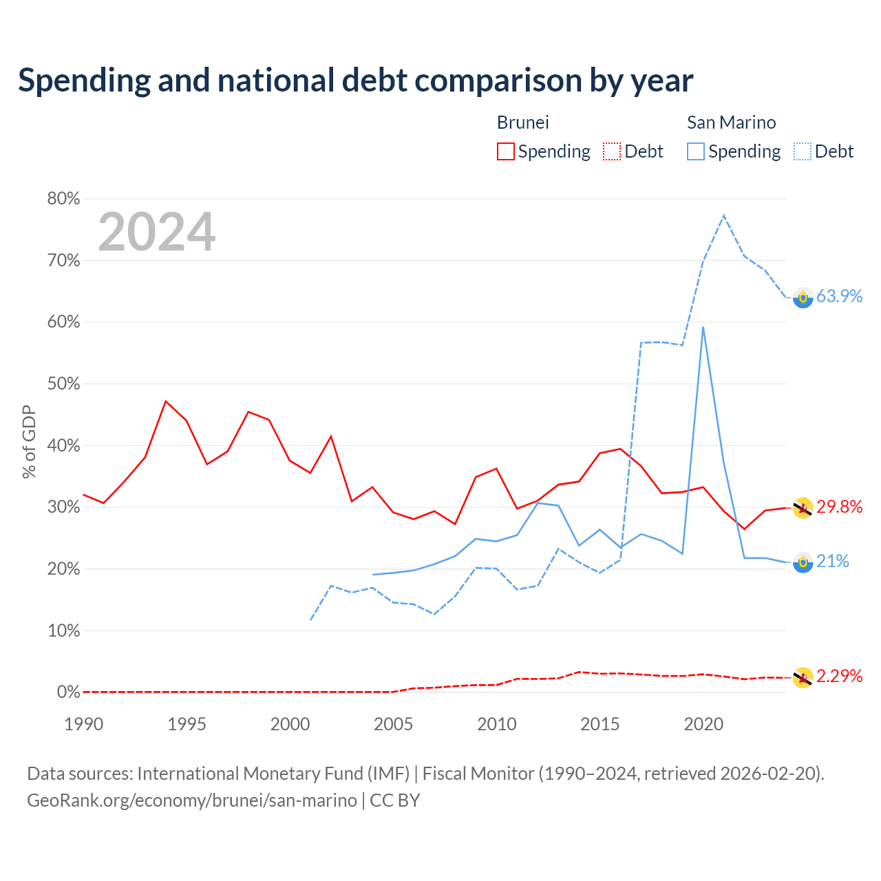 Brunei has $351M in government debt (2.29% of GDP), compared to $1.39B (63.9% of GDP) in San Marino.