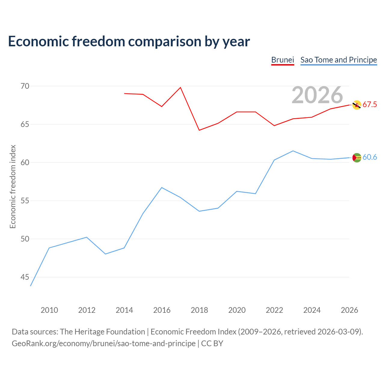 The Economic Freedom Index for Brunei is 67.5, ranking 55/197, compared to 60.6 for Sao Tome and Principe, ranking 93/197. The chart above displays a comparison of annual changes in economic freedom indexes.