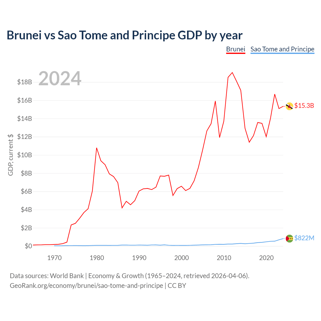 Brunei has a GDP of $15.3B compared to $822M for Sao Tome and Principe, ranking 142/197 and 189/197 by economy size, respectively.