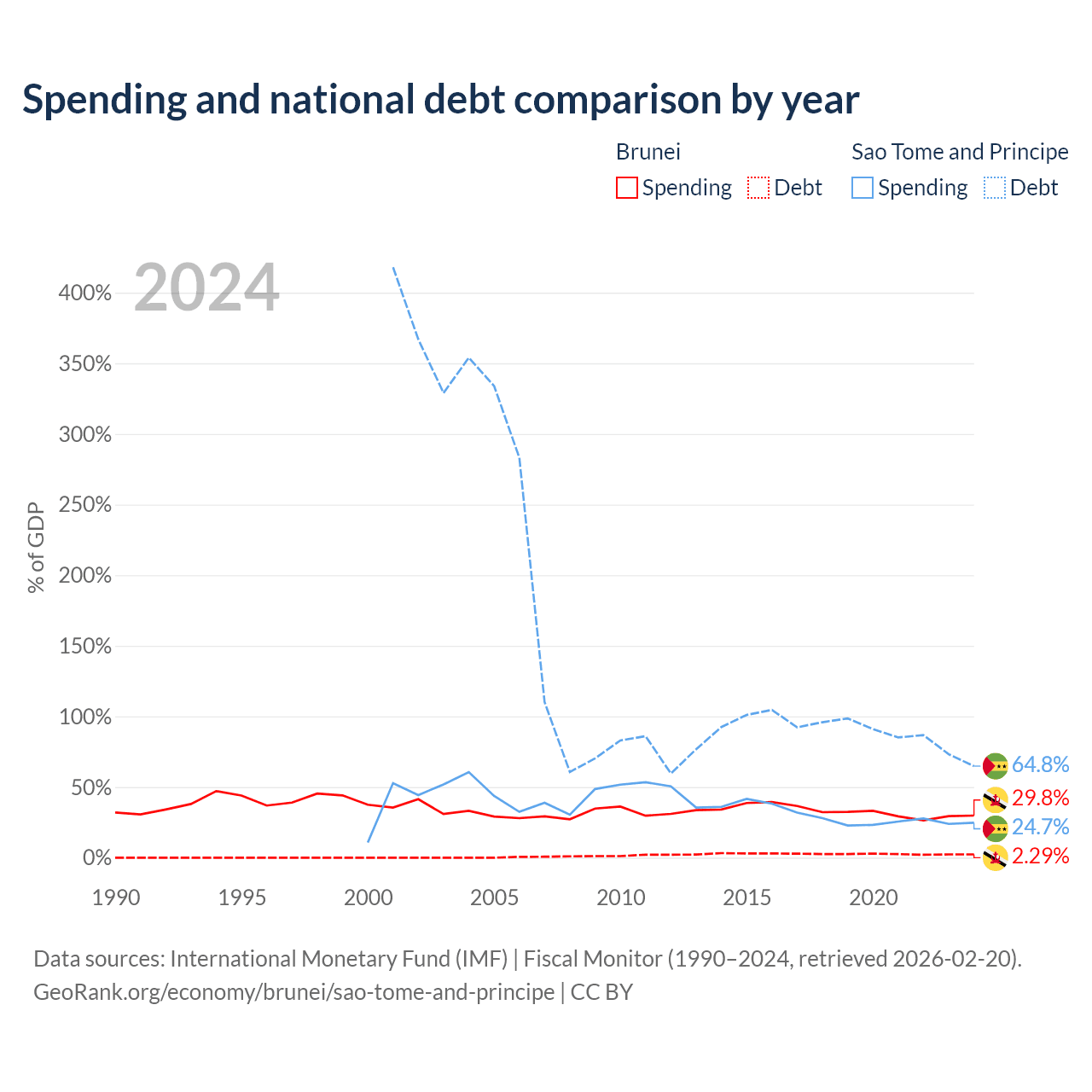 Brunei has $351M in government debt (2.29% of GDP), compared to $533M (64.8% of GDP) in Sao Tome and Principe.