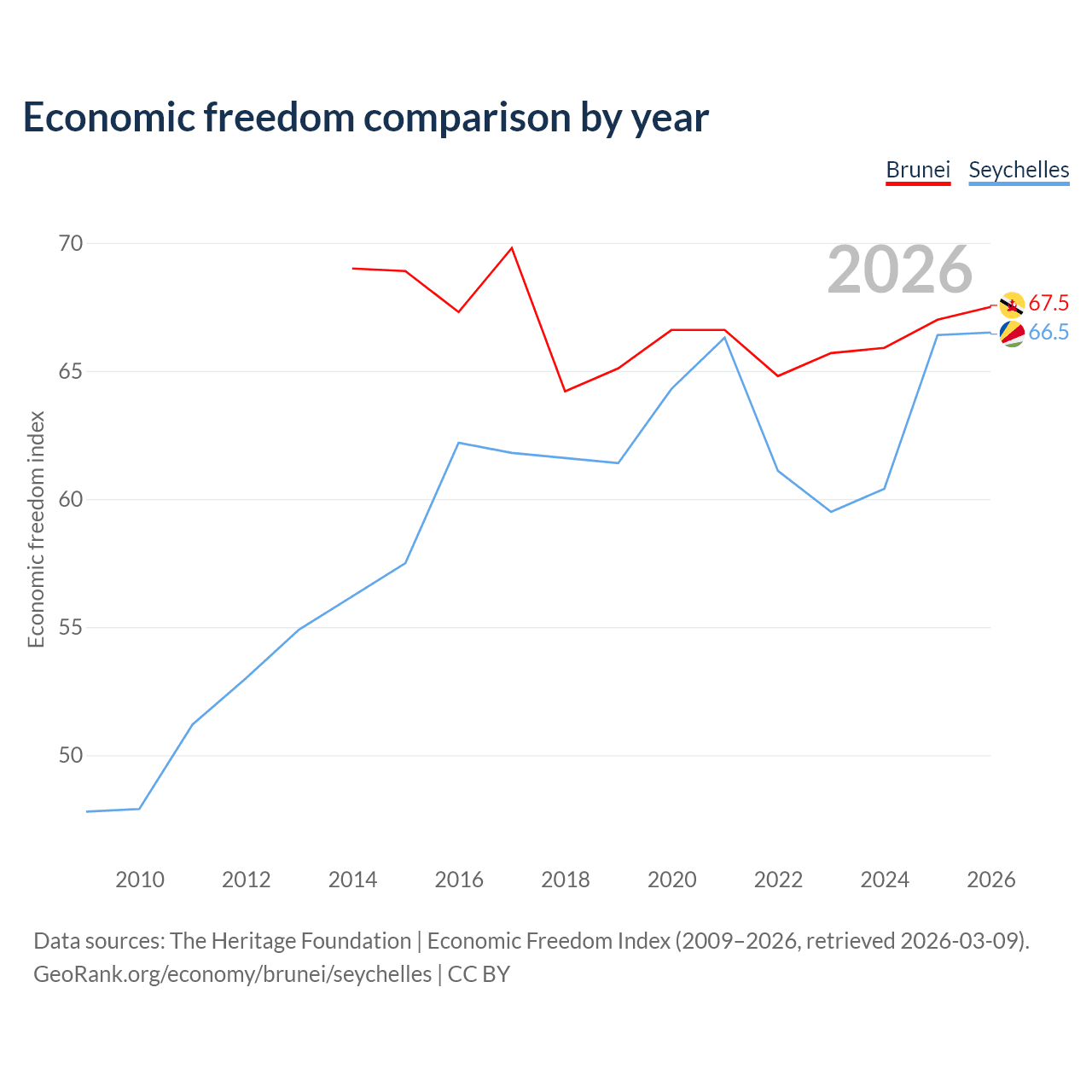 The Economic Freedom Index for Brunei is 67.5, ranking 55/197, compared to 66.5 for the Seychelles, ranking 60/197. The chart above displays a comparison of annual changes in economic freedom indexes.