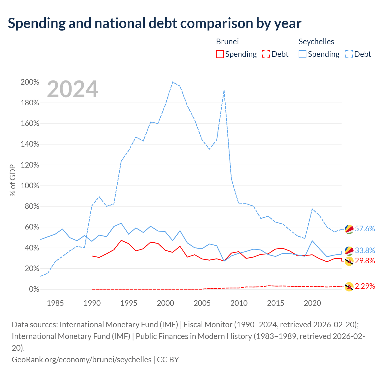 Brunei has $351M in government debt (2.29% of GDP), compared to $1.25B (57.6% of GDP) in the Seychelles.
