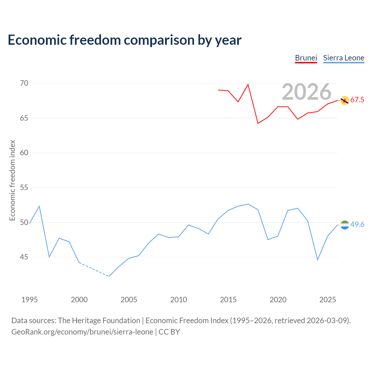 The Economic Freedom Index for Brunei is 67.5, ranking 55/197, compared to 49.6 for Sierra Leone, ranking 165/197. The chart above displays a comparison of annual changes in economic freedom indexes.