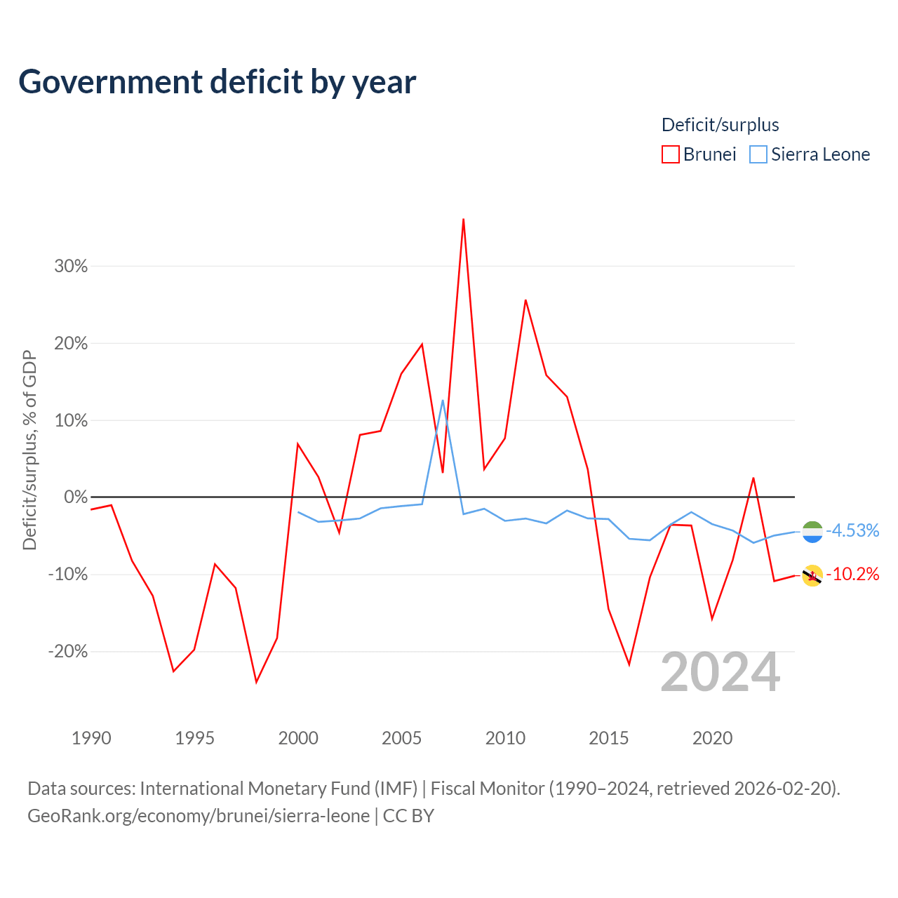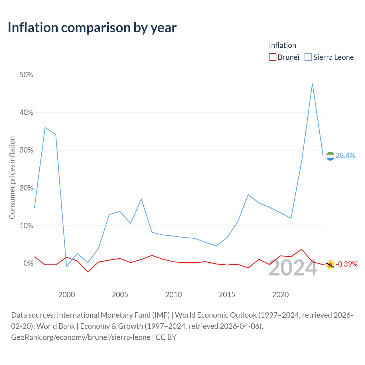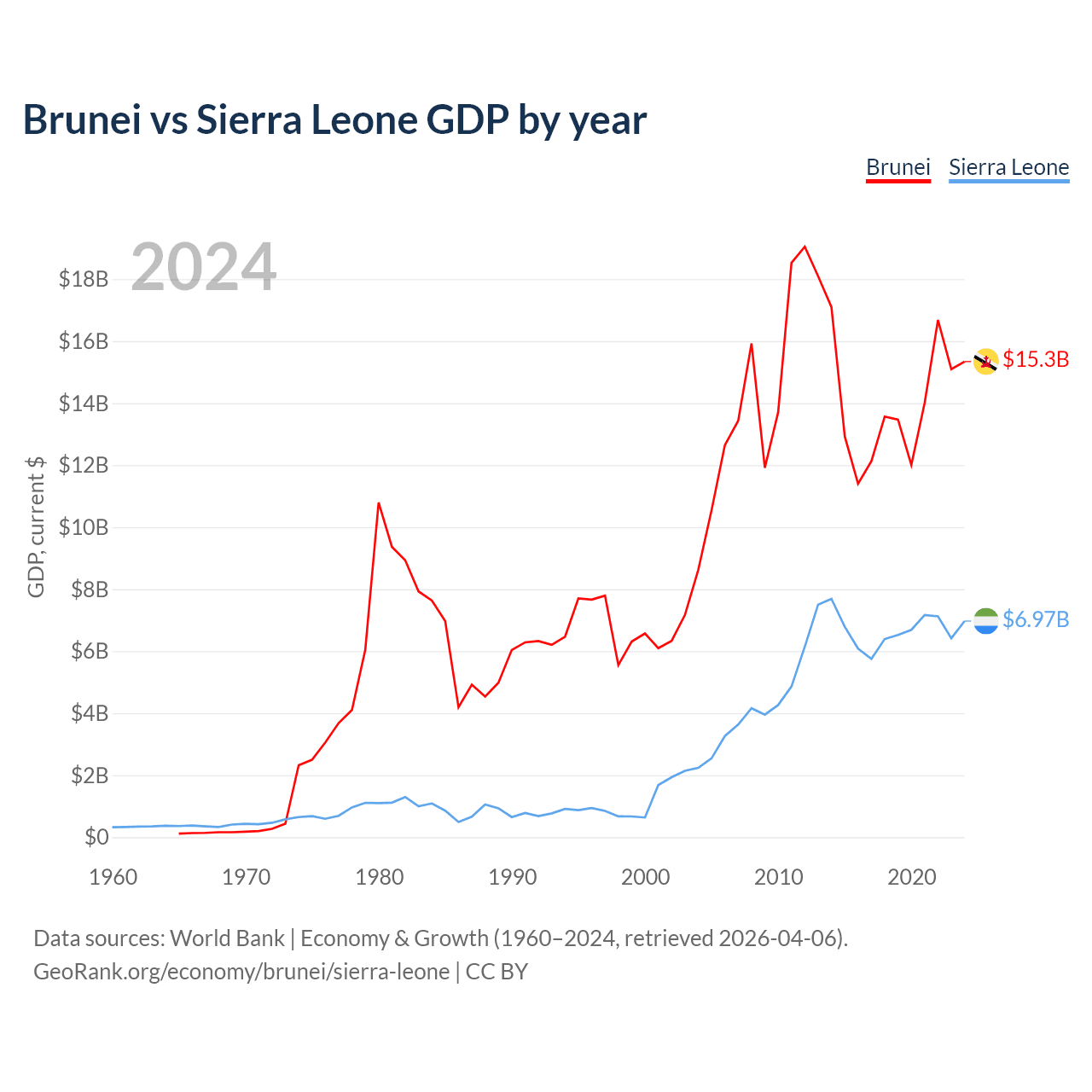Brunei has a GDP of $15.3B compared to $6.97B for Sierra Leone, ranking 142/197 and 160/197 by economy size, respectively.