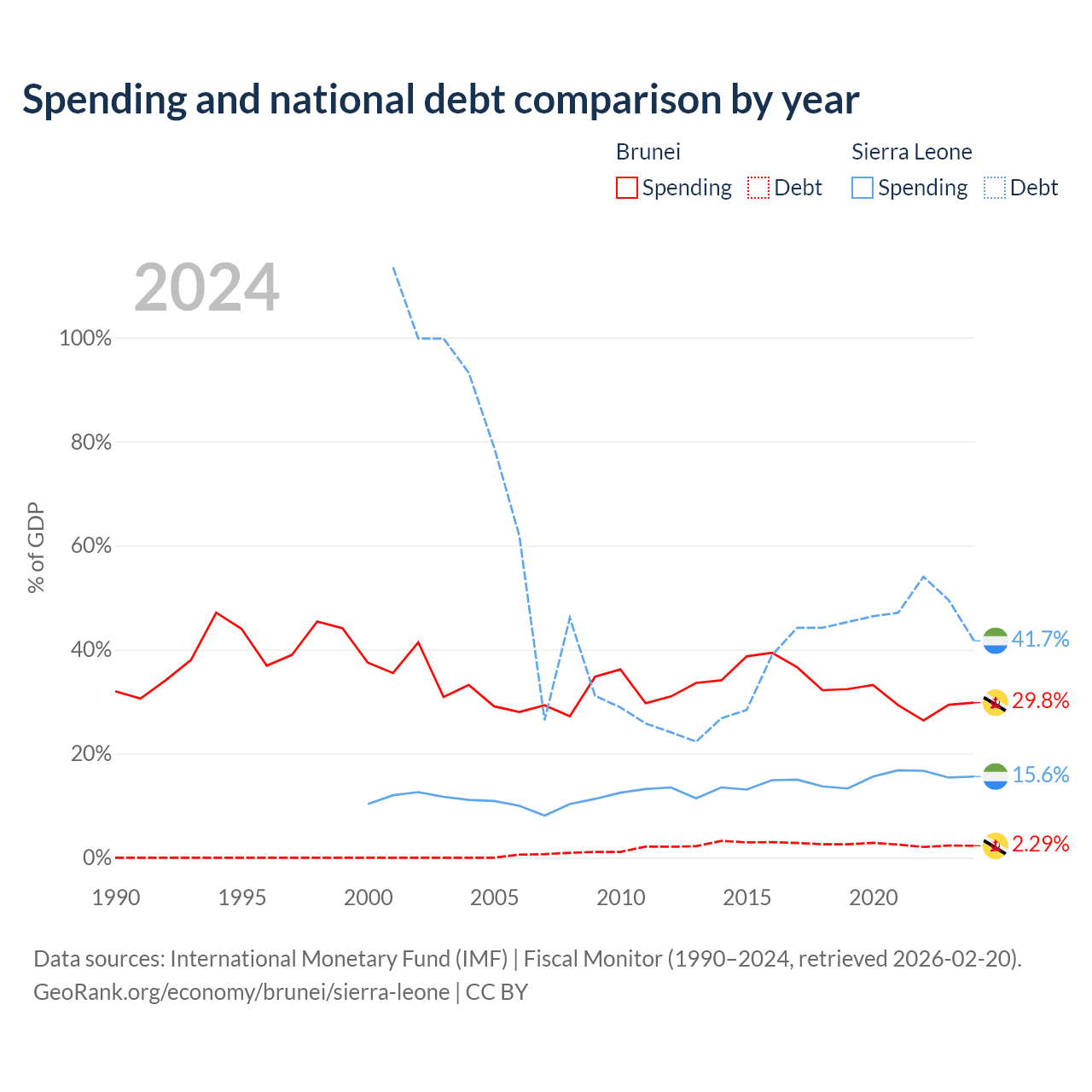 Brunei has $351M in government debt (2.29% of GDP), compared to $2.91B (41.7% of GDP) in Sierra Leone.
