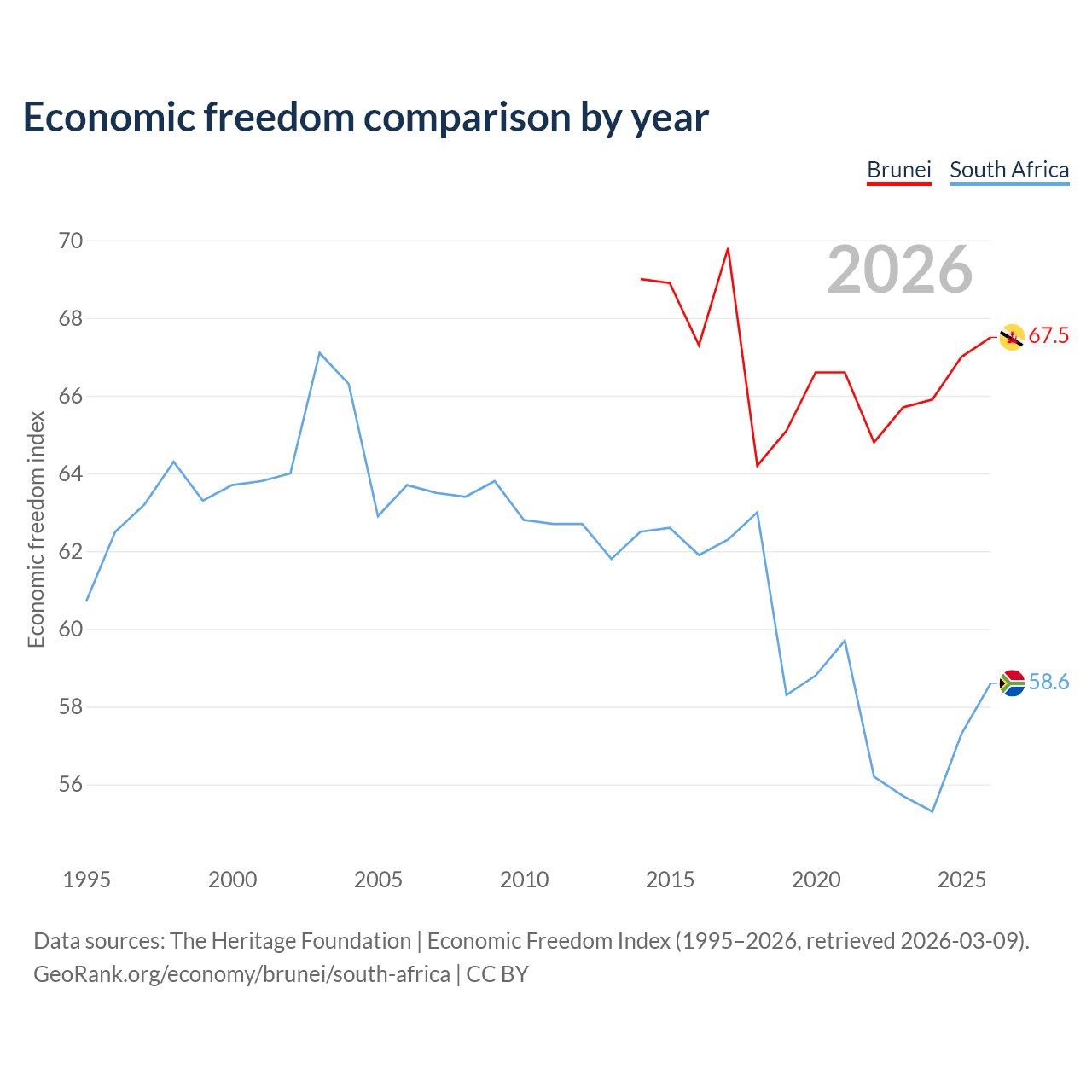 The Economic Freedom Index for Brunei is 67.5, ranking 55/197, compared to 58.6 for South Africa, ranking 110/197. The chart above displays a comparison of annual changes in economic freedom indexes.