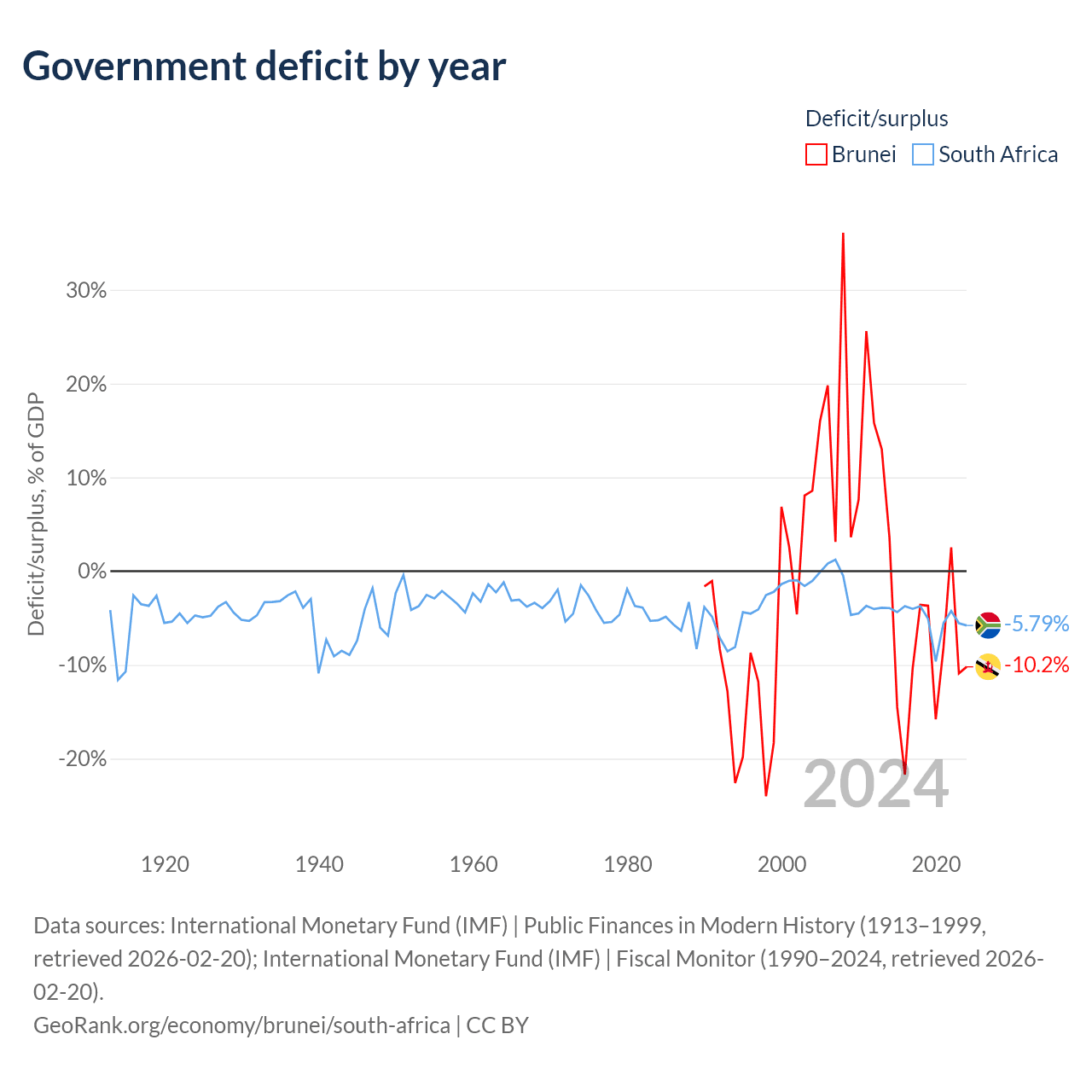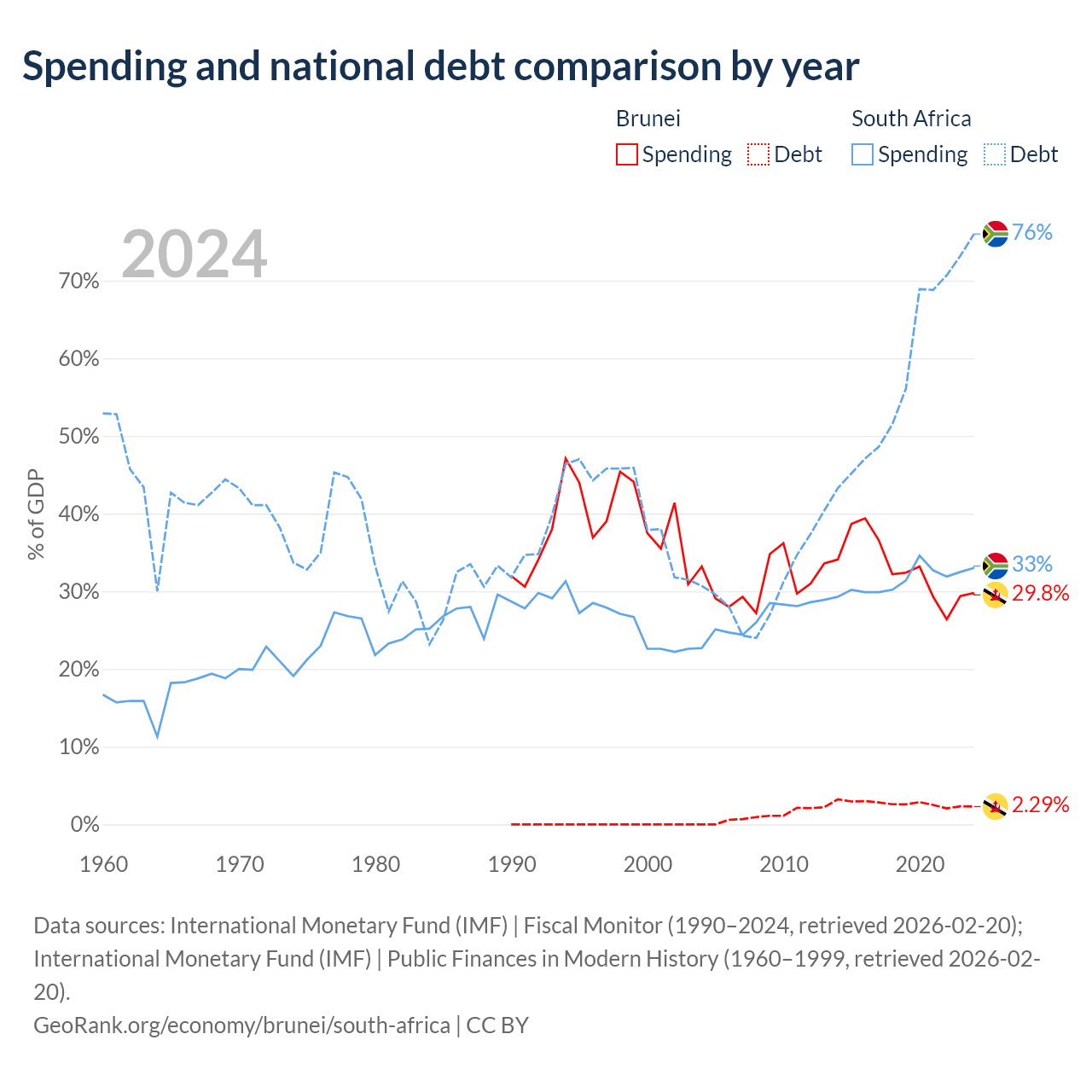 Brunei has $351M in government debt (2.29% of GDP), compared to $305B (76% of GDP) in South Africa.