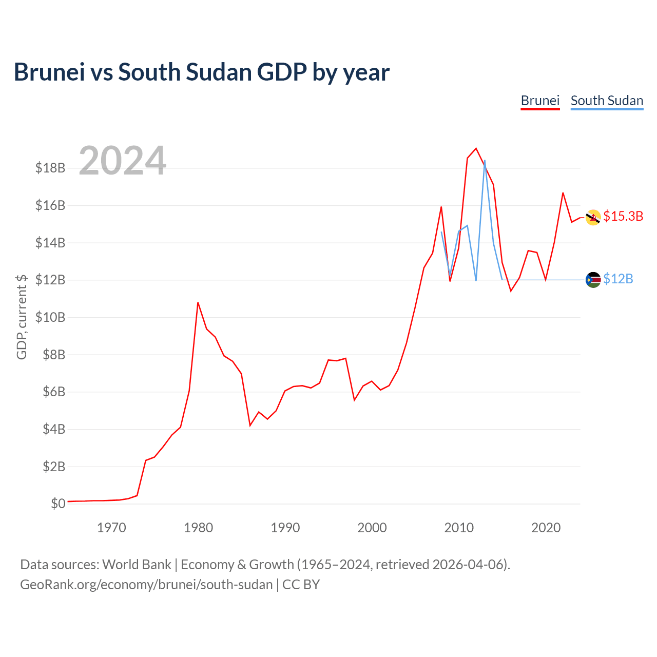 Brunei has a GDP of $15.3B compared to $12B for South Sudan, ranking 142/197 and 149/197 by economy size, respectively.