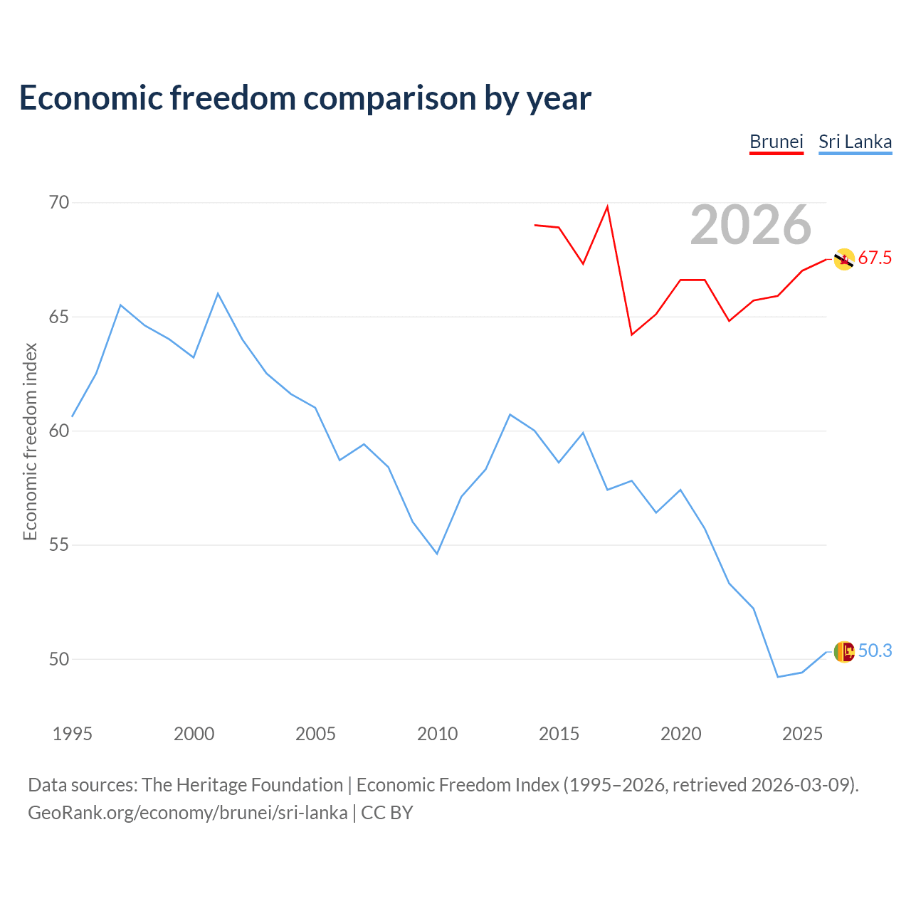 The Economic Freedom Index for Brunei is 67.5, ranking 55/197, compared to 50.3 for Sri Lanka, ranking 162/197. The chart above displays a comparison of annual changes in economic freedom indexes.