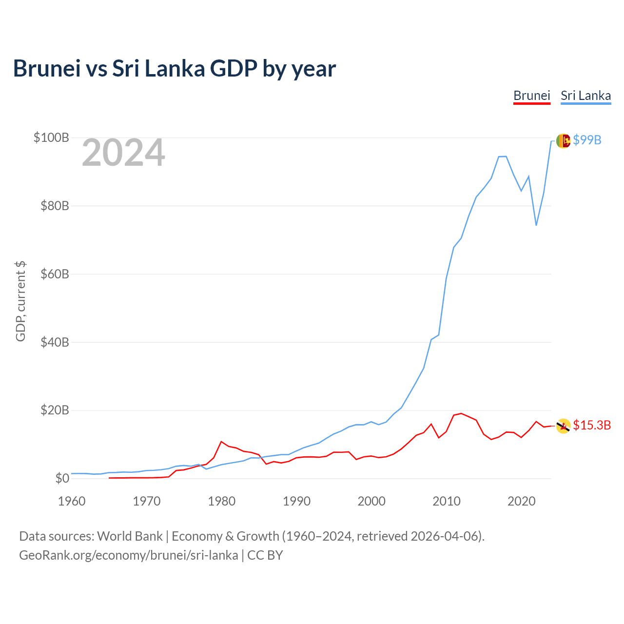 Brunei has a GDP of $15.3B compared to $99B for Sri Lanka, ranking 142/197 and 72/197 by economy size, respectively.