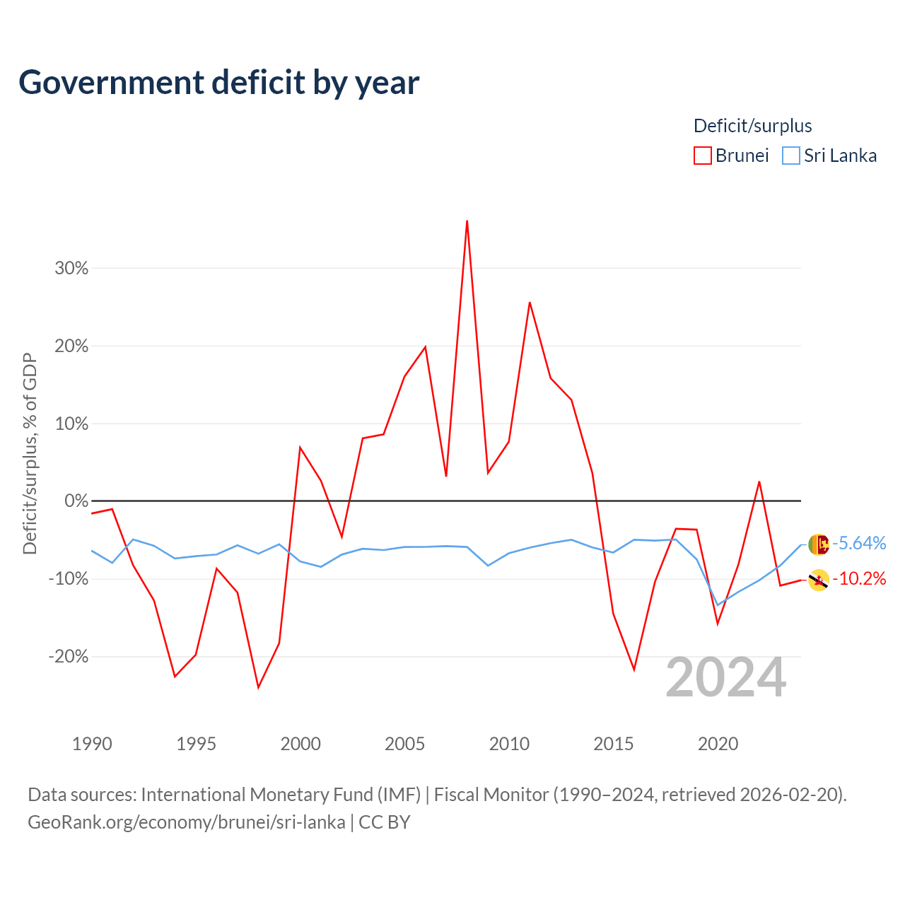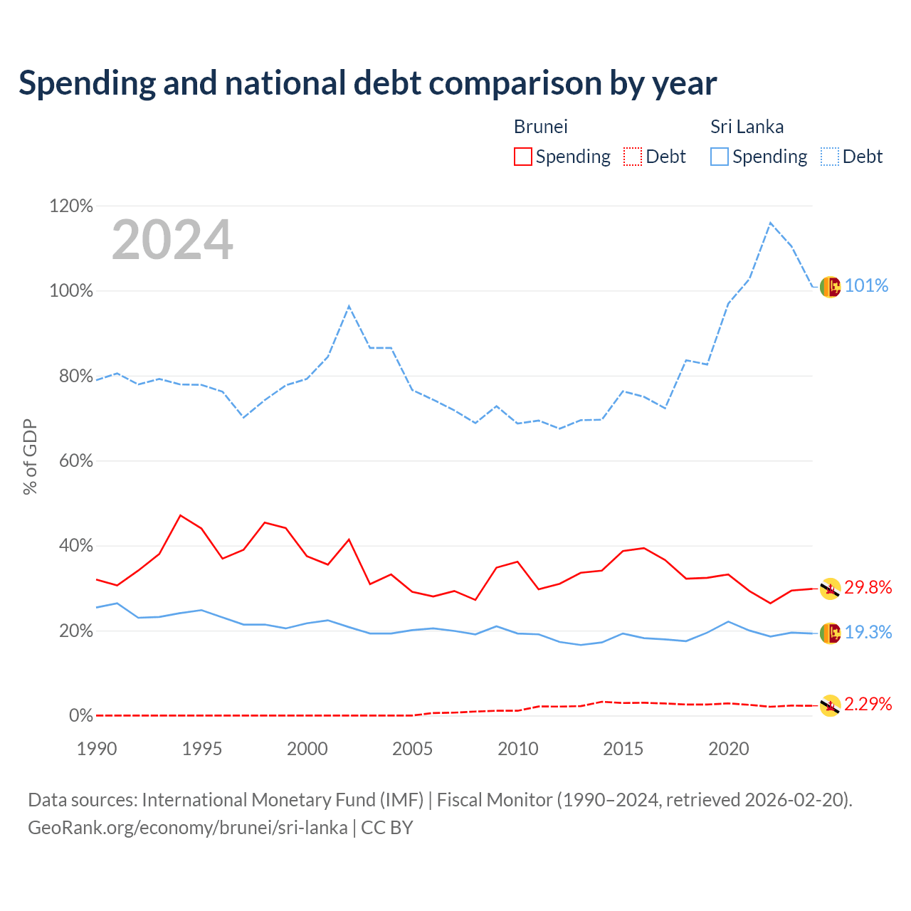 Brunei has $351M in government debt (2.29% of GDP), compared to $99.8B (100.8% of GDP) in Sri Lanka.